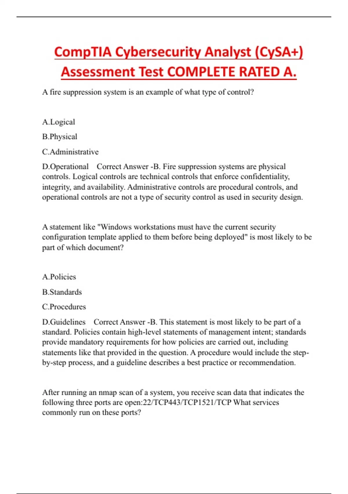 CompTIA Cybersecurity Analyst (CySA+) Assessment Test COMPLETE RATED A.