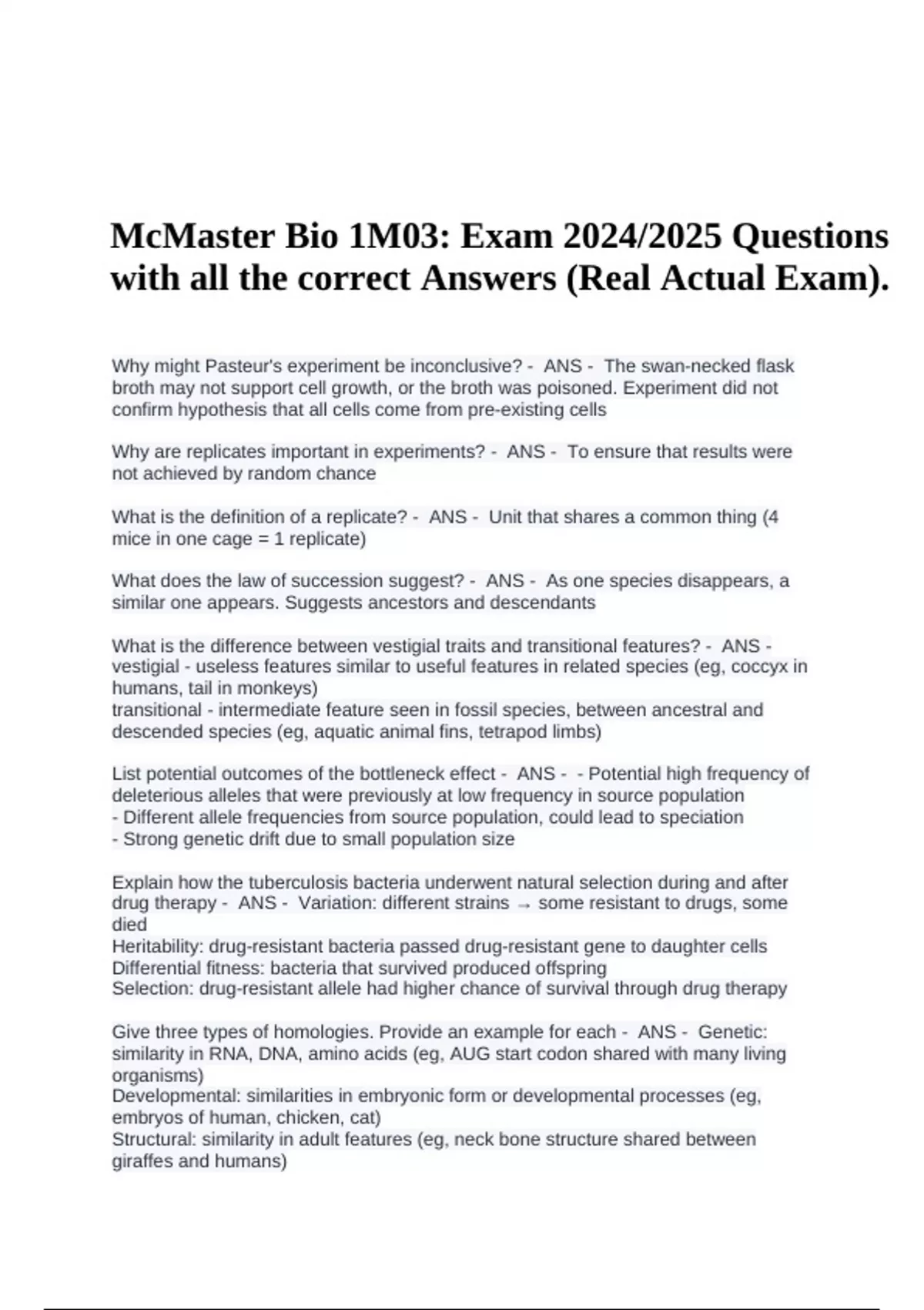 McMaster Bio 1M03: Exam 2024/2025 Questions with all the correct Answers (Real Actual Exam). Why might Pasteur's experiment be inconclusive? - ANS - The swan-necked flask broth may not support cell growth, or the broth was poisoned. Experiment did not confirm hypothesis that all cells come from pre-existing cells Why are replicates important in experiments? - ANS - To ensure that results were not achieved by random chance What is the definition of a replicate? - ANS - Unit that shares a common thing (4 mice in one cage = 1 replicate) What does the law of succession suggest? - ANS - As one species disappears, a similar one appears. Suggests ancestors and descendants What is the difference between vestigial traits and transitional features? - ANS - vestigial - useless features similar to useful features in related species (eg, coccyx in humans, tail in monkeys) transitional - intermediate feature seen in fossil species, between ancestral and descended species (eg, aquatic animal fins, tetrapod limbs) List potential outcomes of the bottleneck effect - ANS - - Potential high frequency of deleterious alleles that were previously at low frequency in source population - Different allele frequencies from source population, could lead to speciation - Strong genetic drift due to small population size Explain how the tuberculosis bacteria underwent natural selection during and after drug therapy - ANS - Variation: different strains → some resistant to drugs, some died Heritability: drug-resistant bacteria passed drug-resistant gene to daughter cells Differential fitness: bacteria that survived produced offspring Selection: drug-resistant allele had higher chance of survival through drug therapy Give three types of homologies. Provide an example for each - ANS - Genetic: similarity in RNA, DNA, amino acids (eg, AUG start codon shared with many living organisms) Developmental: similarities in embryonic form or developmental processes (eg, embryos of human, chicken, cat) Structural: similarity in adult features (eg, neck bone structure shared between giraffes and humans) McMaster Bio 1M03: Exam 2024/2025 Questions with all the correct Answers (Real Actual Exam). What is the difference between acclimatization and adaptation? - ANS - Acclimatization: organism's response to the environment Adaptation: heritable trait that increases the fitness of an individual. Acclimatization does not change alleles, therefore it is not heritable. How are the Galapagos finches an example of directly observed evolution? - ANS - Beak morphology and body size is heritable, and changes due to the environment. Since evolution = ∆ in allele frequencies, selection for deeper beaks kills medium beaks. ∆ in food source selects for smaller beaks, which changes allele frequencies again. How does the Galapagos finches exhibit non-Lamarckian evolution? - ANS - Lamarckian evolution says evolution is goal directed. Bidirectional evolution (deeper to smaller) goes against this; if it was goal, it would've gone in a single direction. `Provide examples where evolution is not goal-directed - ANS - - Parasites lose complex digestive systems - Finch beaks get larger, then smaller Why can humans not fly? What constraints are in place? - ANS - - Historical constraints: since all traits come from previous traits, if we don't have a prior trait for flying, we won't develop flight - Genetic: we lack the necessary genes that would give us wings, flight, etc. Individuals with genotype XX have same phenotype as genotype XY. Which allele is dominant, and what are individuals with intermediate phenotypes called? - ANS - X is dominant, Y is recessive. Incompletely dominant. What is evolution driven by? Of the four, which one introduces new alleles? - ANS - Natural selection, gene flow, genetic drift, mutation. Mutation is the only one that introduces new alleles into populations (other than gene flow) For a given population, there is more observed heterozygotes than predicted in HWE. What are some reasons this might occur? - ANS - - Non-random mating → subconsciously prefer heterozygotes - Natural selection → heterozygotes have an advantage over homozygotes (higher fitness) In order for HWE to proceed, what assumptions must be made? - ANS - - random mating → gametes combine randomly - no natural selection → parent generation survives and donates gametes - no genetic drift → population is infinitely large **why does genetic drift affect small populations? - no gene flow → no alleles lost by migration - no mutation → no new alleles Why is low genetic variation bad? - ANS - If pathogen comes and affects those certain alleles, it can eradicate entire population since no individuals will be able to survive and reproduce. How might a population come under directional selection? - ANS - - Facing selection to develop characteristics that reinforce sexual isolation - Develop traits that provide edge over competing species for resources Obese babies can have trouble breathing, while tiny babies are prone to pneumonia and other complicating affectations. What type of selection are babies likely under? - ANS - Stabilizing selection → selection for intermediate phenotype, elimination of extremes How can inbreeding lead to accelerated natural selection? - ANS - Inbreeding often results in deleterious recessive alleles. Recessive alleles are under purifying selection What can cause a species living in sympatry to diverge? What must it overcome? - ANS - Disruptive selection, gene flow What might occur if the offspring of two parents with differing phenotypes is shown to have low fitness? - ANS - - Selection for less heritability - Selection for reinforcement (extreme) Is genetic drift adaptive? - ANS - Drift can lead to adaptation, but it is not adaptive (i.e. cause of natural selection). Drift is RANDOM with respect to allele frequency change Why is genetic drift more prominent in small populations? - ANS - Alleles can drift to fixation or dele
