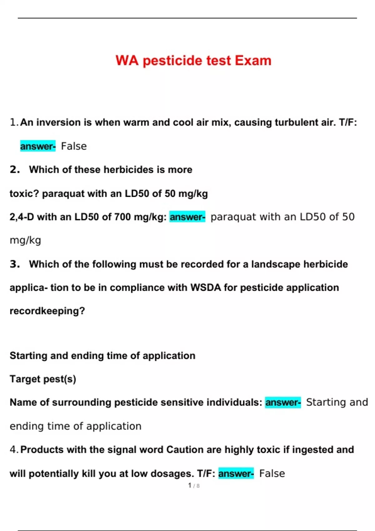 WA Pesticide Test Exam Questions With 100% Correct Answers An inversion is when warm and cool air mix, causing turbulent air. T/F - answerFalse Which of these herbicides is more toxic? paraquat with an LD50 of 50 mg/kg 2,4-D with an LD50 of 700 mg/kg - answerparaquat with an LD50 of 50 mg/kg Which of the following must be recorded for a landscape herbicide application to be in compliance with WSDA for pesticide application recordkeeping? Starting and ending time of application Target pest(s) Name of surrounding pesticide sensitive individuals - answerStarting and ending time of application Products with the signal word Caution are highly toxic if ingested and will potentially kill you at low dosages. T/F - answerFalse Which type of degradation is one of the most important means by which pesticides are broken down in the soil? chemical degradation microbial degradation photodegradation - answermicrobial degradation The ability of a chemical to cause harm years later from a low dose and extended exposure is termed: - answerchronic toxicity Who is exempt from WPS? - answerCattle ranchers The term used to describe pesticides chemically binding or adhering to soil particles is: - answeradsorption Pesticides may be transferred from the application site to other locations by: - answerSpray drift, vapor drift, run-off, leaching When the pest population reaches the economic injury level, it is time to take management action. T/F - answerFalse The first step in pest management is: - answeridentify the pest What is the best way to handle leftover spray mix after an application? - answerapply it to a labeled site The best way to prevent pesticides from becoming hazardous waste is: - answerrinse containers as soon as they are empty and empty rinsate into spray tank for application to a site on the label Which of the following is classified as a pesticide in Washington? - answerSpray adjuvant The three steps to a spill response are: - answercontrol-contain-cleanup An inversion is when warm and cool air mix, causing turbulent air and increasing long distance drift potential. T/F - answerfalse Which type of soil increases pesticide adsorption potential? - answerfine soil with a lot of organic matter A pesticide may be designated a RUP (restricted use pesticide) by EPA, but not by WSDA. T/F - answerFalse What are the minimum storage requirements for a pesticide with a WARNING label? - answerSecured and out of reach of children Where is the pre-harvest interval listed on the pesticide label? - answerDirections of use Organophosphates that cause systemic poisonings in humans are: - answerinsecticides Where would you look on a pesticide label to find information about protecting pollinators? - answerEnvironmental hazards Laboratory studies measuring______toxicity are used to determine the signal word on a pesticide label. - answeracute Which of the following increases drift potential? 3 MPH wind and low spray pressure 10 MPH wind and 12 foot boom height