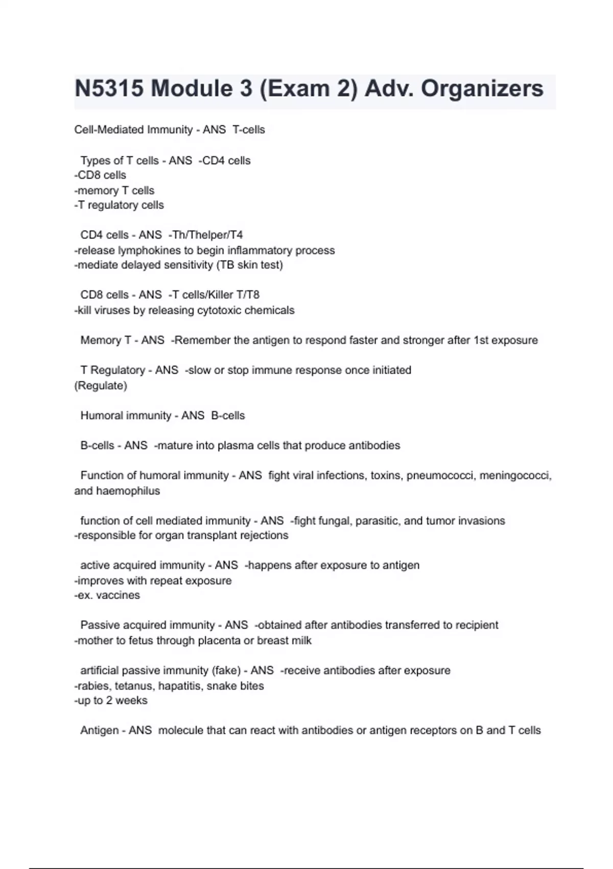 N5315 Module 3 (Exam 2) Adv. Organizers Cell-Mediated Immunity - ANS T-cells Types of T cells - ANS -CD4 cells -CD8 cells -memory T cells -T regulatory cells CD4 cells - ANS -Th/Thelper/T4 -release lymphokines to begin inflammatory process -mediate delayed sensitivity (TB skin test) CD8 cells - ANS -T cells/Killer T/T8 -kill viruses by releasing cytotoxic chemicals Memory T - ANS -Remember the antigen to respond faster and stronger after 1st exposure T Regulatory - ANS -slow or stop immune response once initiated (Regulate) Humoral immunity - ANS B-cells