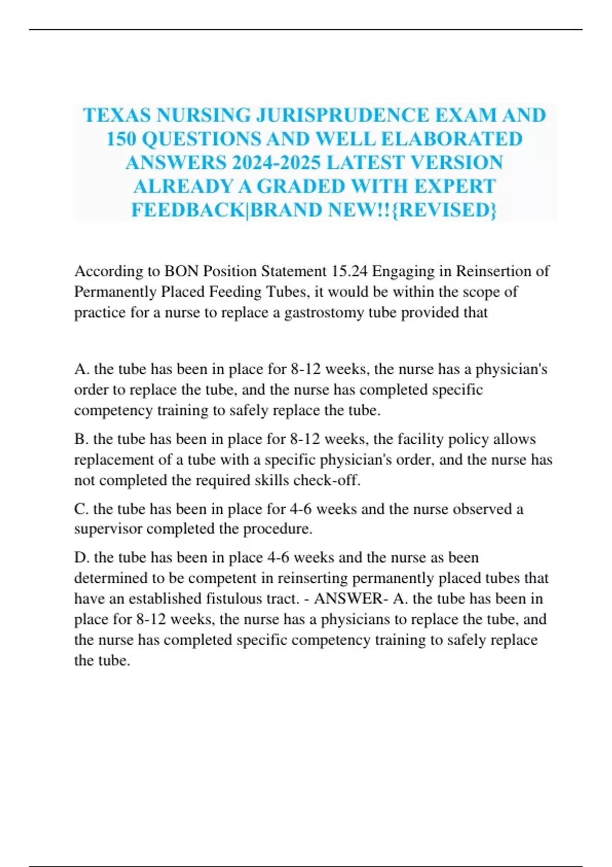 TEXAS NURSING JURISPRUDENCE EXAM AND 150 QUESTIONS AND WELL ELABORATED ANSWERS LATEST VERSION ALREADY A GRADED WITH EXPERT FEEDBACK|BRAND NEW!!{REVISED}
