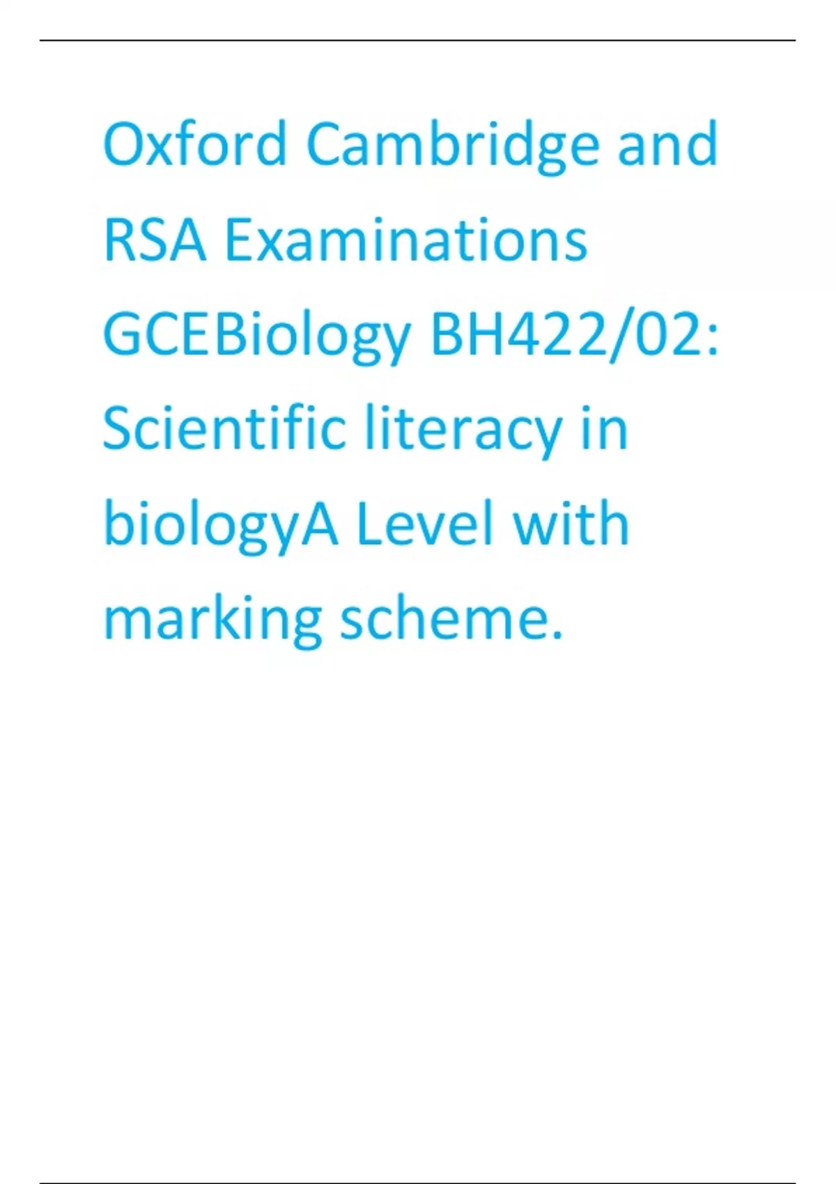 Oxford Cambridge and RSA Examinations GCEBiology BH422/02: Scientific literacy in biologyA Level with marking scheme.