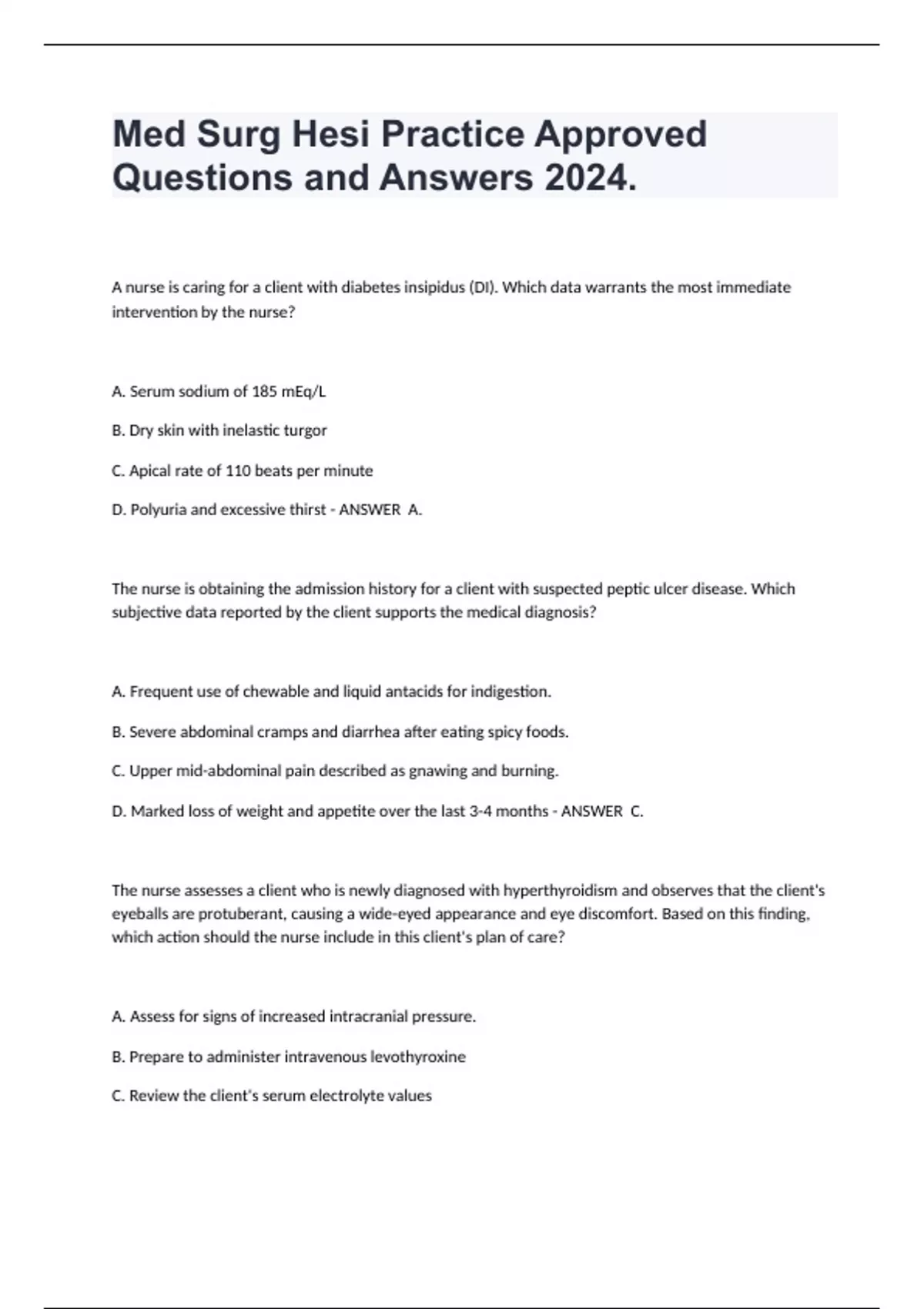 Med Surg Hesi Practice Approved Questions and Answers 2024. A nurse is caring for a client with diabetes insipidus (DI). Which data warrants the most immediate intervention by the nurse? A. Serum sodium of 185 mEq/L B. Dry skin with inelastic turgor C. Apical rate of 110 beats per minute D. Polyuria and excessive thirst A. The nurse is obtaining the admission history for a client with suspected peptic ulcer disease. Which subjective data reported by the client supports the medical diagnosis? A. Frequent use of chewable and liquid antacids for indigestion. B. Severe abdominal cramps and diarrhea after eating spicy foods. C. Upper mid-abdominal pain described as gnawing and burning. D. Marked loss of weight and appetite over the last 3-4 months C. The nurse assesses a client who is newly diagnosed with hyperthyroidism and observes that the client's eyeballs are protuberant, causing a wide-eyed appearance and eye discomfort. Based on this finding, which action should the nurse include in this client's plan of care? A. Assess for signs of increased intracranial pressure. B. Prepare to administer intravenous levothyroxine C. Review the client's serum electrolyte values D. Obtain a prescription for artificial tear drops. D.
