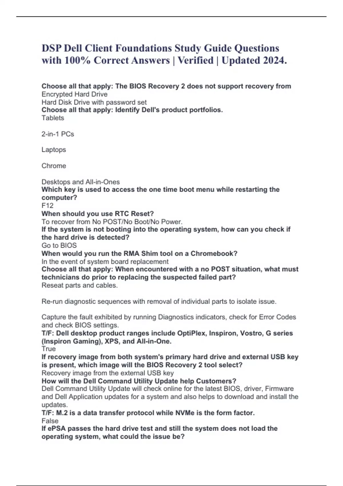 DSP Dell Client Foundations Study Guide Questions with 100% Correct Answers | Verified | Updated 2024. Choose all that apply: The BIOS Recovery 2 does not support recovery from Encrypted Hard Drive Hard Disk Drive with password set Choose all that apply: Identify Dell's product portfolios. Tablets 2-in-1 PCs Laptops Chrome Desktops and All-in-Ones Which key is used to access the one time boot menu while restarting the computer? F12 When should you use RTC Reset? To recover from No POST/No Boot/No Power. If the system is not booting into the operating system, how can you check if the hard drive is detected? Go to BIOS When would you run the RMA Shim tool on a Chromebook? In the event of system board replacement Choose all that apply: When encountered with a no POST situation, what must technicians do prior to replacing the suspected failed part? Reseat parts and cables. Re-run diagnostic sequences with removal of individual parts to isolate issue. Capture the fault exhibited by running Diagnostics indicators, check for Error Codes and check BIOS settings. T/F: Dell desktop product ranges include OptiPlex, Inspiron, Vostro, G series (Inspiron Gaming), XPS, and All-in-One. True If recovery image from both system's primary hard drive and external USB key is present, which image will the BIOS Recovery 2 tool select? Recovery image from the external USB key How will the Dell Command Utility Update help Customers? Dell Command Utility Update will check online for the latest BIOS, driver, Firmware and Dell Application updates for a system and also helps to download and install the updates. T/F: M.2 is a data transfer protocol while NVMe is the form factor. False If ePSA passes the hard drive test and still the system does not load the operating system, what could the issue be?