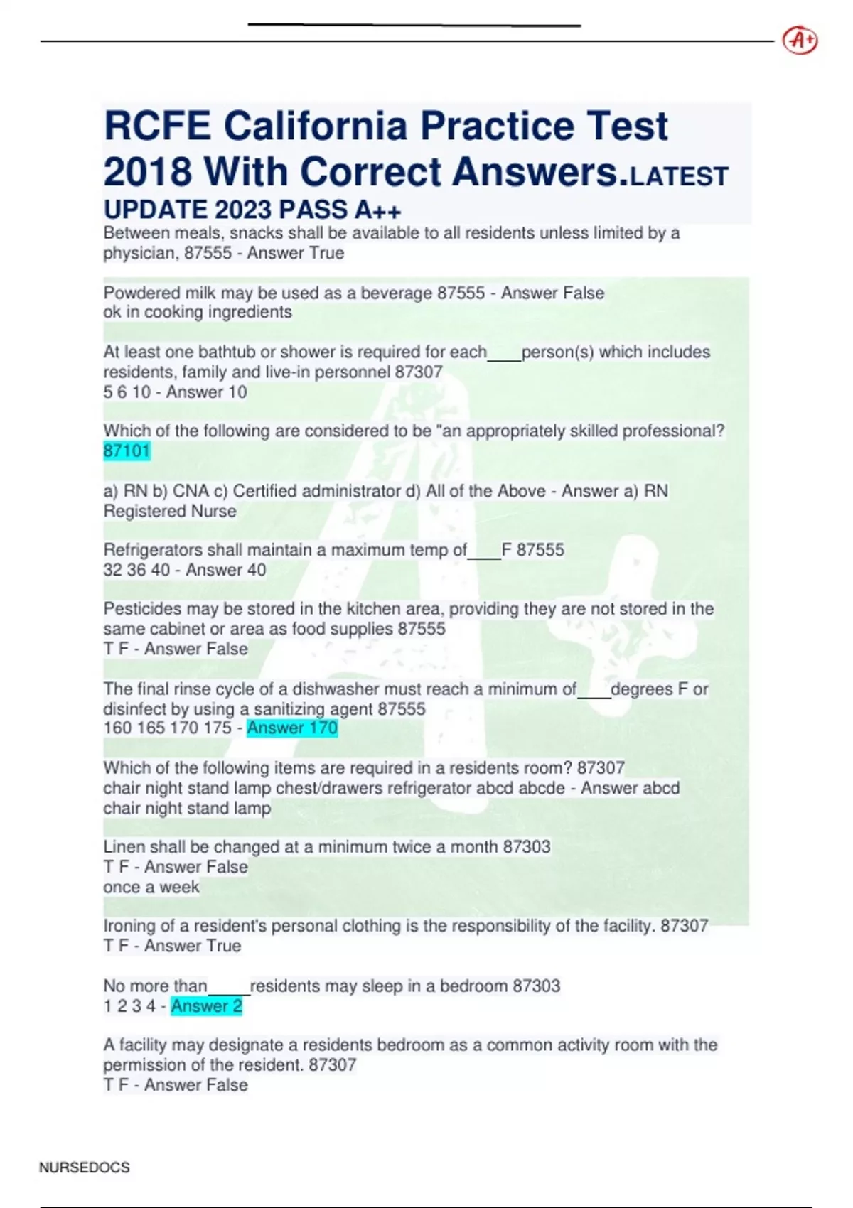 RCFE California Practice Test 2018 With Correct Answers. LATEST UPDATE 2023 PASS A++