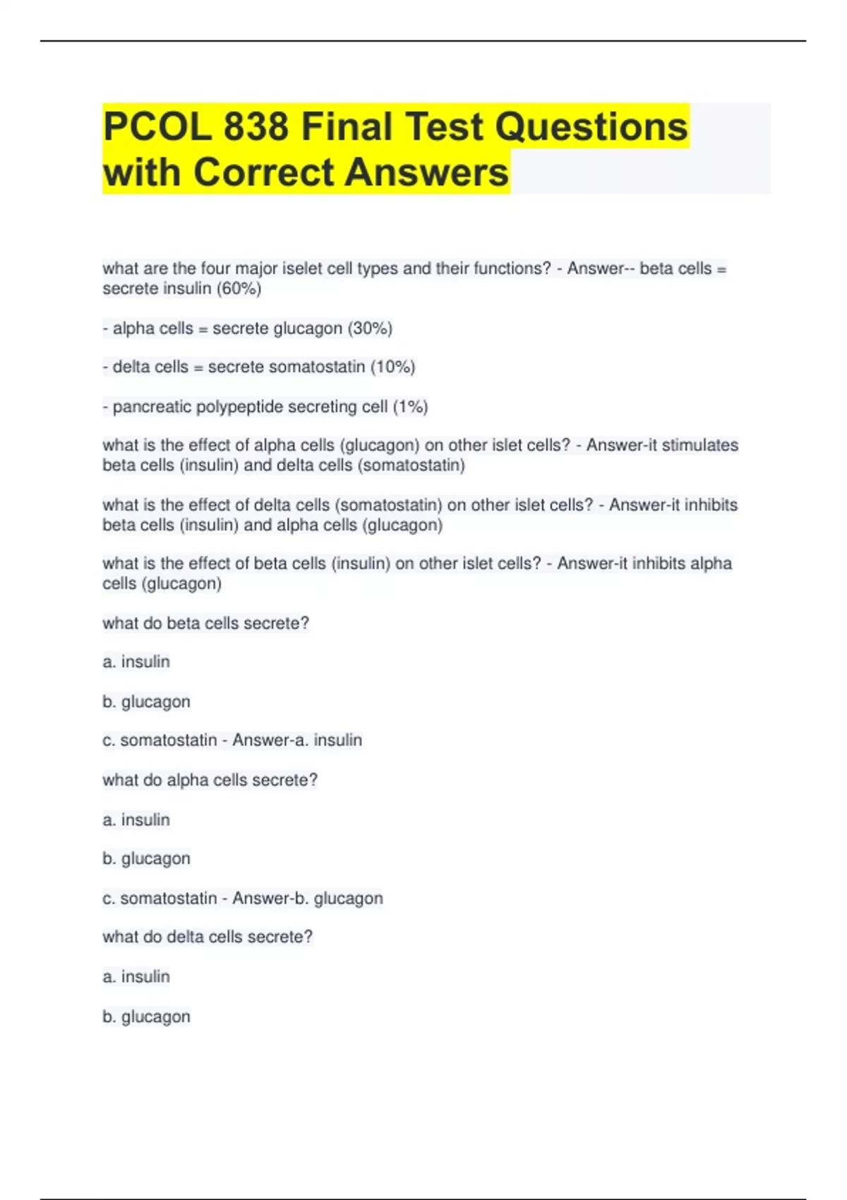 PCOL 838 Final Test Questions with Correct Answers what are the four major iselet cell types and their functions? - Answer-- beta cells = secrete insulin (60%) - alpha cells = secrete glucagon (30%) - delta cells = secrete somatostatin (10%) - pancreatic polypeptide secreting cell (1%) what is the effect of alpha cells (glucagon) on other islet cells? - Answer-it stimulates beta cells (insulin) and delta cells (somatostatin) what is the effect of delta cells (somatostatin) on other islet cells? - Answer-it inhibits beta cells (insulin) and alpha cells (glucagon) what is the effect of beta cells (insulin) on other islet cells? - Answer-it inhibits alpha cells (glucagon) what do beta cells secrete? a. insulin b. glucagon c. somatostatin - Answer-a. insulin what do alpha cells secrete? a. insulin b. glucagon c. somatostatin - Answer-b. glucagon what do delta cells secrete? a. insulin b. glucagon c. somatostatin - Answer-c. somatostatin what does the presence of C peptide mean? - Answer-it means insulin is being made what is the effect of insulin responsive cells (IRCs) on the body? - Answer-- liver and muscle = decrease gluconeogenesis and glycogenolysis - adipocytes = increased lipogenesis and adipogenesis