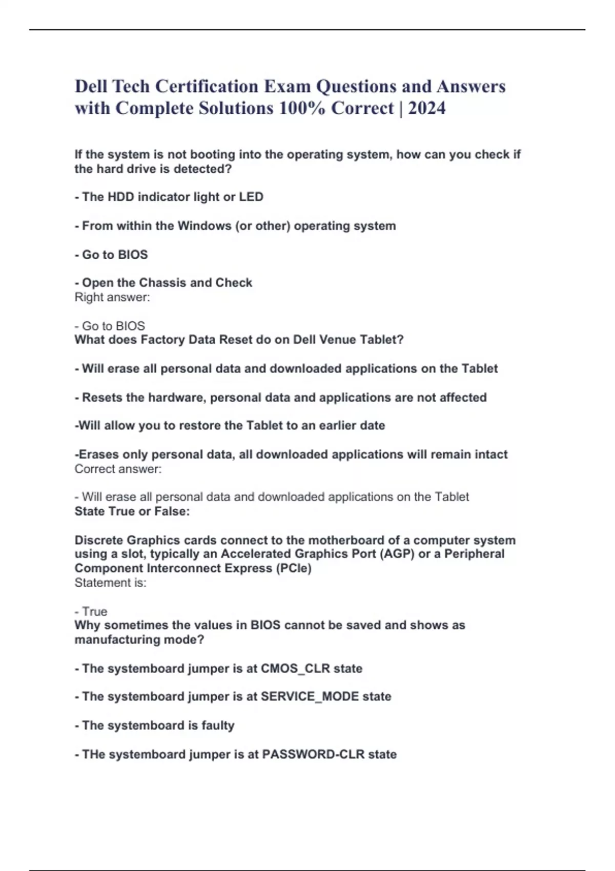 Dell Tech Certification Exam Questions and Answers with Complete Solutions 100% Correct | 2024 If the system is not booting into the operating system, how can you check if the hard drive is detected? - The HDD indicator light or LED - From within the Windows (or other) operating system - Go to BIOS - Open the Chassis and Check Right answer: - Go to BIOS What does Factory Data Reset do on Dell Venue Tablet? - Will erase all personal data and downloaded applications on the Tablet - Resets the hardware, personal data and applications are not affected -Will allow you to restore the Tablet to an earlier date -Erases only personal data, all downloaded applications will remain intact Correct answer: - Will erase all personal data and downloaded applications on the Tablet State True or False: Discrete Graphics cards connect to the motherboard of a computer system using a slot, typically an Accelerated Graphics Port (AGP) or a Peripheral Component Interconnect Express (PCIe) Statement is: - True Why sometimes the values in BIOS cannot be saved and shows as manufacturing mode? - The systemboard jumper is at CMOS_CLR state - The systemboard jumper is at SERVICE_MODE state - The systemboard is faulty - THe systemboard jumper is at PASSWORD-CLR state