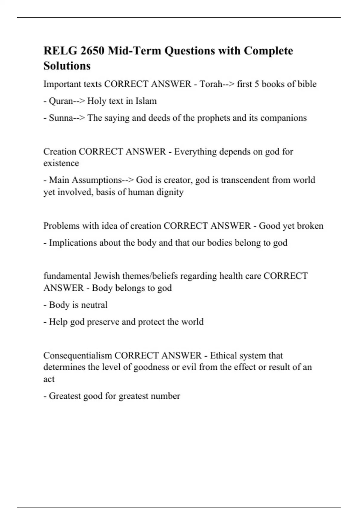 RELG 2650 Mid-Term Questions with Complete Solutions