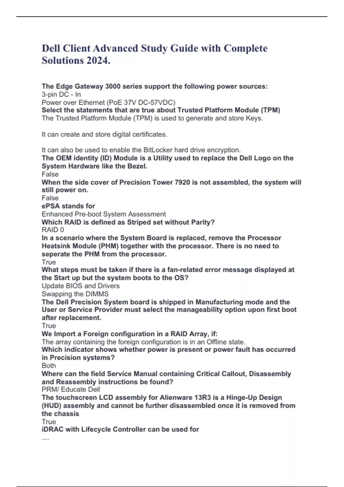 Dell Client Advanced Study Guide with Complete Solutions 2024. The Edge Gateway 3000 series support the following power sources: 3-pin DC - In Power over Ethernet (PoE 37V DC-57VDC) Select the statements that are true about Trusted Platform Module (TPM) The Trusted Platform Module (TPM) is used to generate and store Keys. It can create and store digital certificates. It can also be used to enable the BitLocker hard drive encryption. The OEM identity (ID) Module is a Utility used to replace the Dell Logo on the System Hardware like the Bezel. False When the side cover of Precision Tower 7920 is not assembled, the system will still power on. False ePSA stands for Enhanced Pre-boot System Assessment Which RAID is defined as Striped set without Parity? RAID 0 In a scenario where the System Board is replaced, remove the Processor Heatsink Module (PHM) together with the processor. There is no need to seperate the PHM from the processor. True What steps must be taken if there is a fan-related error message displayed at the Start up but the system boots to the OS? Update BIOS and Drivers Swapping the DIMMS The Dell Precision System board is shipped in Manufacturing mode and the User or Service Provider must select the manageability option upon first boot after replacement. True We Import a Foreign configuration in a RAID Array, if: The array containing the foreign configuration is in an Offline state. Which indicator shows whether power is present or power fault has occurred in Precision systems? Both Where can the field Service Manual containing Critical Callout, Disassembly and Reassembly instructions be found? PRM/ Educate Dell The touchscreen LCD assembly for Alienware 13R3 is a Hinge-Up Design (HUD) assembly and cannot be further disassembled once it is removed from the chassis True iDRAC with Lifecycle Controller can be used for ....