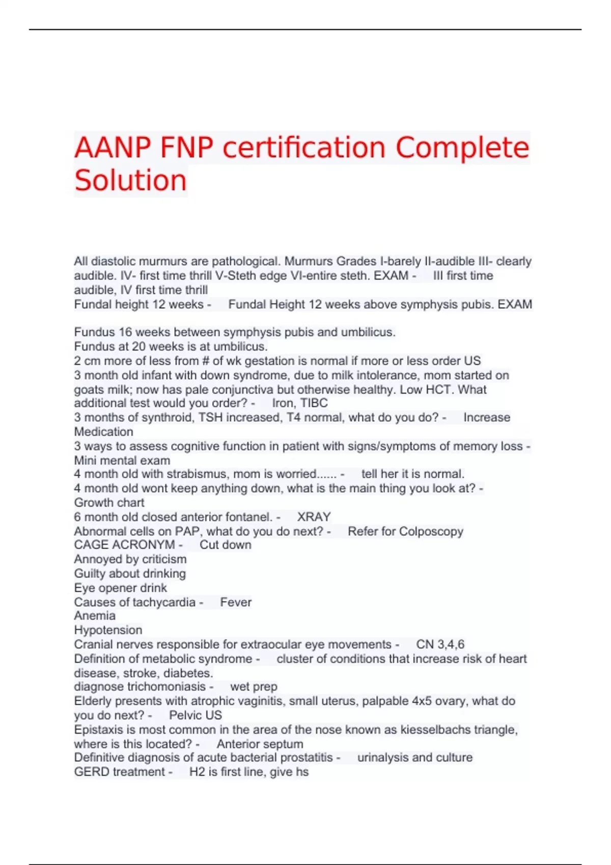 AANP FNP certification Complete Solution All diastolic murmurs are pathological. Murmurs Grades I-barely II-audible III- clearly audible. IV- first time thrill V-Steth edge VI-entire steth. EXAM - III first time audible, IV first time thrill Fundal height 12 weeks - Fundal Height 12 weeks above symphysis pubis. EXAM Fundus 16 weeks between symphysis pubis and umbilicus. Fundus at 20 weeks is at umbilicus. 2 cm more of less from # of wk gestation is normal if more or less order US 3 month old infant with down syndrome, due to milk intolerance, mom started on goats milk; now has pale conjunctiva but otherwise healthy. Low HCT. What additional test would you order? - Iron, TIBC 3 months of synthroid, TSH increased, T4 normal, what do you do? - Increase Medication 3 ways to assess cognitive function in patient with signs/symptoms of memory loss - Mini mental exam 4 month old with strabismus, mom is worried...... - tell her it is normal. 4 month old wont keep anything down, what is the main thing you look at? - Growth chart 6 month old closed anterior fontanel. - XRAY Abnormal cells on PAP, what do you do next? - Refer for Colposcopy CAGE ACRONYM - Cut down Annoyed by criticism Guilty about drinking Eye opener drink Causes of tachycardia - Fever Anemia Hypotension Cranial nerves responsible for extraocular eye movements - CN 3,4,6 Definition of metabolic syndrome - cluster of conditions that increase risk of heart disease, stroke, diabetes. diagnose trichomoniasis - wet prep Elderly presents with atrophic vaginitis, small uterus, palpable 4x5 ovary, what do you do next? - Pelvic US Epistaxis is most common in the area of the nose known as kiesselbachs triangle, where is this located? - Anterior septum Definitive diagnosis of acute bacterial prostatitis - urinalysis and culture GERD treatment - H2 is first line, give hs Grade 3 cells on Pap, treatment? - LEEP excision Fingernail hematoma treatment? - drill hole and drain blood? Increased risk of ectopic pregnancy - Salpingitis, or history of abortion, PID, Koplick spots - Measles (rubeola). Grains of salt lesions inside mouth in Measles Koplick spots - Measles (rubeola). Grains of salt lesions inside mouth in Measles Legg-Calve-Perthes Disease - Avascular necrosis of the proximal femoral head Lipid level of 1500, increased risk for? - Pancreatitis Low HGB, Low HCT, High MCV indicates what? - Macrocytic anemia, B12 Def Man with BPH, prostate feels on digital exam? - Enlarged, symmetrical, smooth Man with HTN, CAD, present femoral pulses but absent pedal - Arterial Insufficiency McMurray's Sign (+) palpable or audible click while extending with varus stress - Meniscus tears Lachman's Test - pivot shift test (ACL tear) Newborn with foot turned in, what do you do? - refer to orthopedist Osgood-Schlatter disease - Knee pain. inflammation or irritation of the tibia at its point of attachment with the patellar tendon Patient forgot to start Thanksgiving dinner and husband states she has trouble remembering tasks and trouble with organization. What is this indicative of? - Alzheimer's Pt has Barretts Esophagus, insurance no longer covers GI who was treating condition. Pt at FNP office wanting refill prescriptions. What do you do? - Refer to oncologist Pt presents with rash on shoulder, erythematous maculopapular rash with center clearing and scaling? - Tinea Corporis Pt presents with "bag of worms:, indicates? - Varicocele Pt with atopic dermatitis, look for what other diseases? - Asthma Pt with bleeding after menopause - endometrial biopsy, need to screen for cancer Pt with hx of PID, increased rick for? - Infertility Pt with HIV took high potency anti viral treatments and CD4 is 400, what does this indicate? - This is good. Want higher than 350 Pt with hx of htn and stroke, now having memory loss. What does this indicate? - Vascular dementia Pregnant teacher with exposure to 5ths disease (SLAP CHEEK), what risk is there to the fetus? - slap cheek, PVB19, rash hands / feet Fetal death and birth defects Quick assessment of patients fall risk? Timed Get up and Go - Timed Get up and Go Red beefy tongue? - pernicious anemia Rotator cuff injury presentation - disturbs sleep, arm weakness, dull ache Shingles near eye - immediate referral to ophthalmology Signs and symptoms of Roseola (6ths disease) ? - Viral infection Can result in a maculopapular rash, but up to 70% of cases proceed without the rash stage -Usually accompanied by a high fever (41°C or 105°F) that comes on quickly and lasts up to 3 days followed by rash -Seizures may occur during this period. -On the fourth day, the fever disappears and the rash appears, first on chest and trunk, then less prominently on the face and limbs. -High fever, pink flat or raised rash Treatment for chronic alcoholism: - 12 step program Treatment for Gonorrhea? - Rocephin 250mg IMx1 plus Azithromycin 1 gm orally x1 to cover chlamydia. , or doxy 100 mg BID x7d. Green colored vaginal discharge, friable cervix. EXAM Report to health department Young female want birth control, forgets to take pills, does not want to get pregnant for at least 5 years: - IUD Basal cell cancer - Waxy, pearly, telangiectasia, ulcer center lesion -most common type of skin cancer caused by UV exposure. Metastatic is rare Actinic Keratosis - Scaly red to yellow located in sun exposed area -a precancerous skin growth that occurs on sun-damaged skin Actinic Keratosis - Numerous round dry pink to red areas. Scaly red to yellow located in sun exposed area -a pre squamous cell carcinoma occurs on sun-damaged skin biopsy cryo or 5fu cream subungual hematoma tx - Make a hole and drain the blood Moderate acne treatment - Without inflammation: Topical retinoid Moderate inflammation: Topical Retinoid or benzoyl peroxide or Azaleic acic ( very expensive and hard to get covered) PLUS ADD Oral antibiotics: doxycycline or tetracycline or minocycline- (tetracyclines has been proven most affective for inflammatory acne) Minocycline- long term use has been 