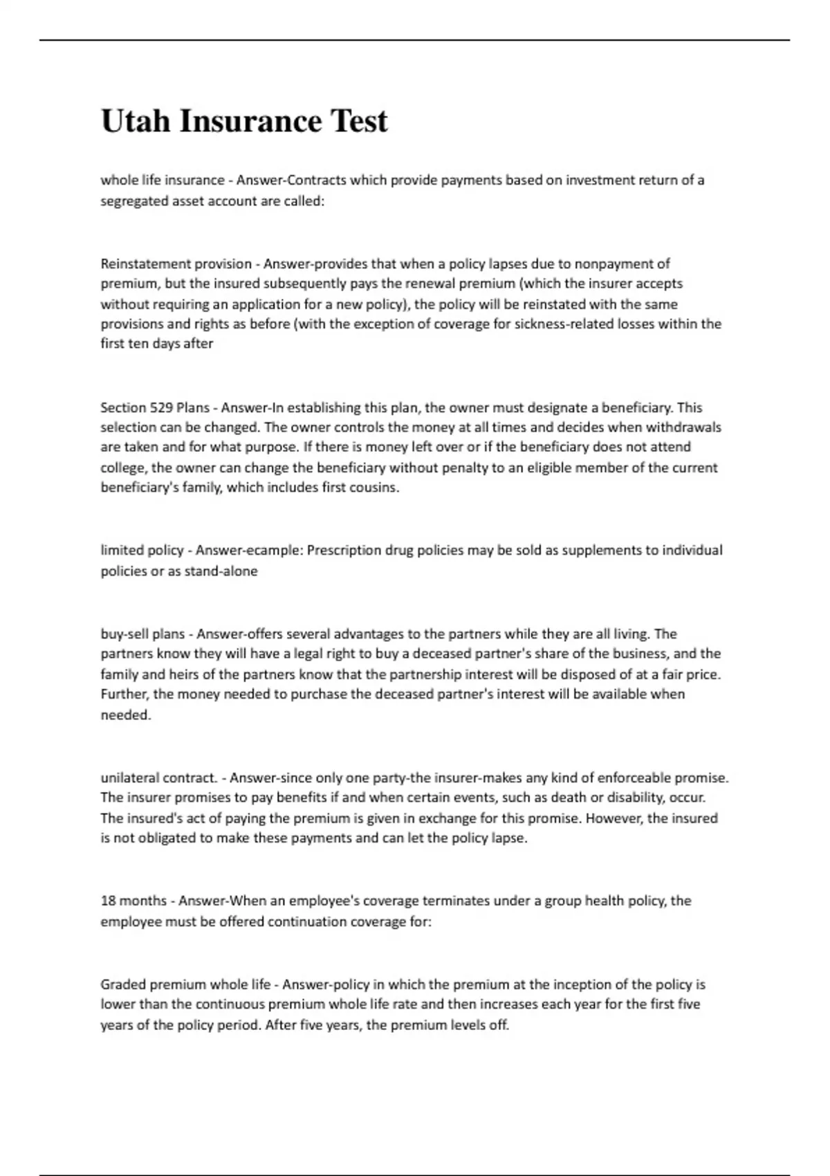 whole life insurance - Answer-Contracts which provide payments based on investment return of a segregated asset account are called: Reinstatement provision - Answer-provides that when a policy lapses due to nonpayment of premium, but the insured subsequently pays the renewal premium (which the insurer accepts without requiring an application for a new policy), the policy will be reinstated with the same provisions and rights as before (with the exception of coverage for sickness-related losses within the first ten days after Section 529 Plans - Answer-In establishing this plan, the owner must designate a beneficiary. This selection can be changed. The owner controls the money at all times and decides when withdrawals are taken and for what purpose. If there is money left over or if the beneficiary does not attend college, the owner can change the beneficiary without penalty to an eligible member of the current beneficiary's family, which includes first cousins. limited policy - Answer-ecample: Prescription drug policies may be sold as supplements to individual policies or as stand-alone buy-sell plans - Answer-offers several advantages to the partners while they are all living. The partners know they will have a legal right to buy a deceased partner's share of the business, and the family and heirs of the partners know that the partnership interest will be disposed of at a fair price. Further, the money needed to purchase the deceased partner's interest will be available when needed. unilateral contract. - Answer-since only one party-the insurer-makes any kind of enforceable promise. The insurer promises to pay benefits if and when certain events, such as death or disability, occur. The insured's act of paying the premium is given in exchange for this promise. However, the insured is not obligated to make these payments and can let the policy lapse. 18 months - Answer-When an employee's coverage terminates under a group health policy, the employee must be offered continuation coverage for: Graded premium whole life - Answer-policy in which the premium at the inception of the policy is lower than the continuous premium whole life rate and then increases each year for the first five years of the policy period. After five years, the premium levels guaranty associations - Answer-All states have established one, funds or associations. If an insurer becomes financially unable to pay its claims, this will cover the consumers' unpaid claims. Insurance companies fund this associations through assessments. managed care plans - Answer-HMOs, PPOs, and POS plans, offer comprehensive medical services to their members. They also apply financial incentives that encourage providers to keep both the quantity and cost of services in check and motivate members to select cost-effective providers.