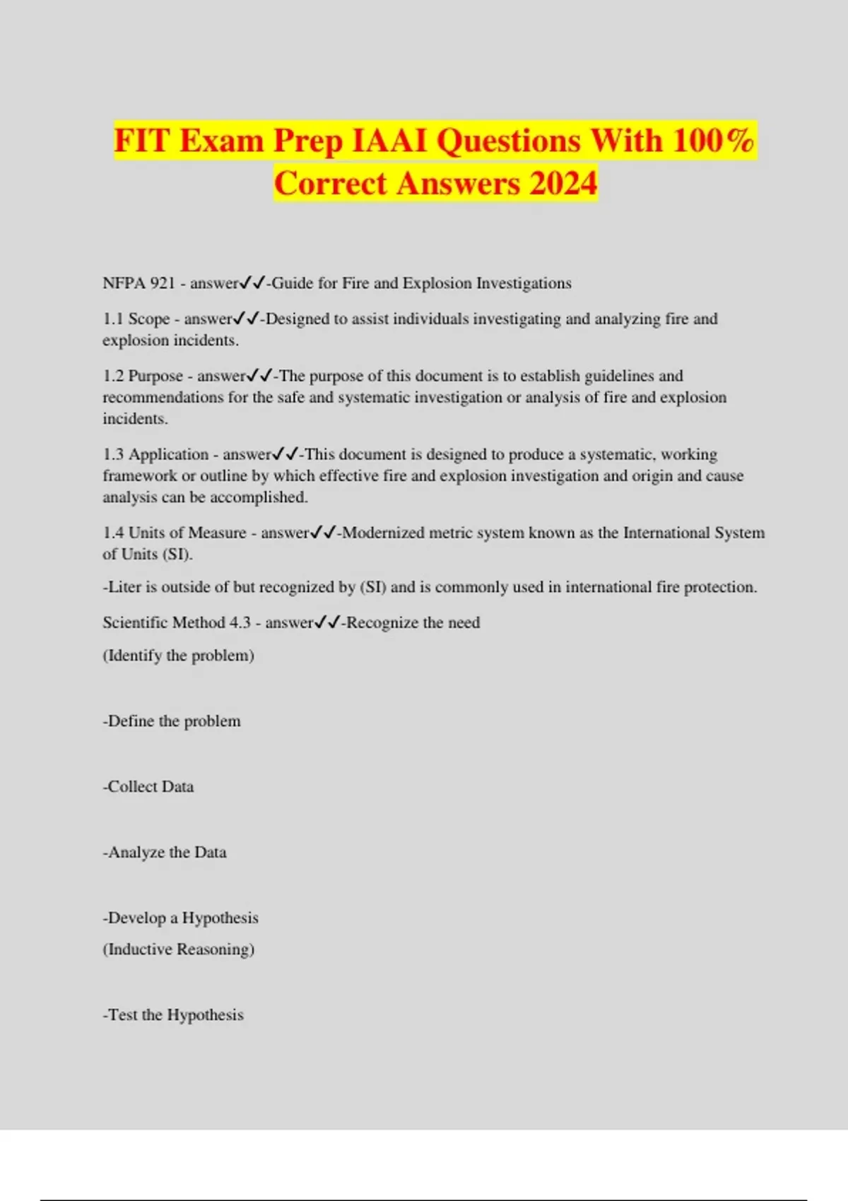 FIT Exam Prep IAAI Questions With 100% Correct Answers 2024 NFPA 921 - answer-Guide for Fire and Explosion Investigations 1.1 Scope - answer-Designed to assist individuals investigating and analyzing fire and explosion incidents. 1.2 Purpose - answer-The purpose of this document is to establish guidelines and recommendations for the safe and systematic investigation or analysis of fire and explosion incidents. 1.3 Application - answer-This document is designed to produce a systematic, working framework or outline by which effective fire and explosion investigation and origin and cause analysis can be accomplished. 1.4 Units of Measure - answer-Modernized metric system known as the International System of Units (SI). -Liter is outside of but recognized by (SI) and is commonly used in international fire protection. Scientific Method 4.3 - answer-Recognize the nee