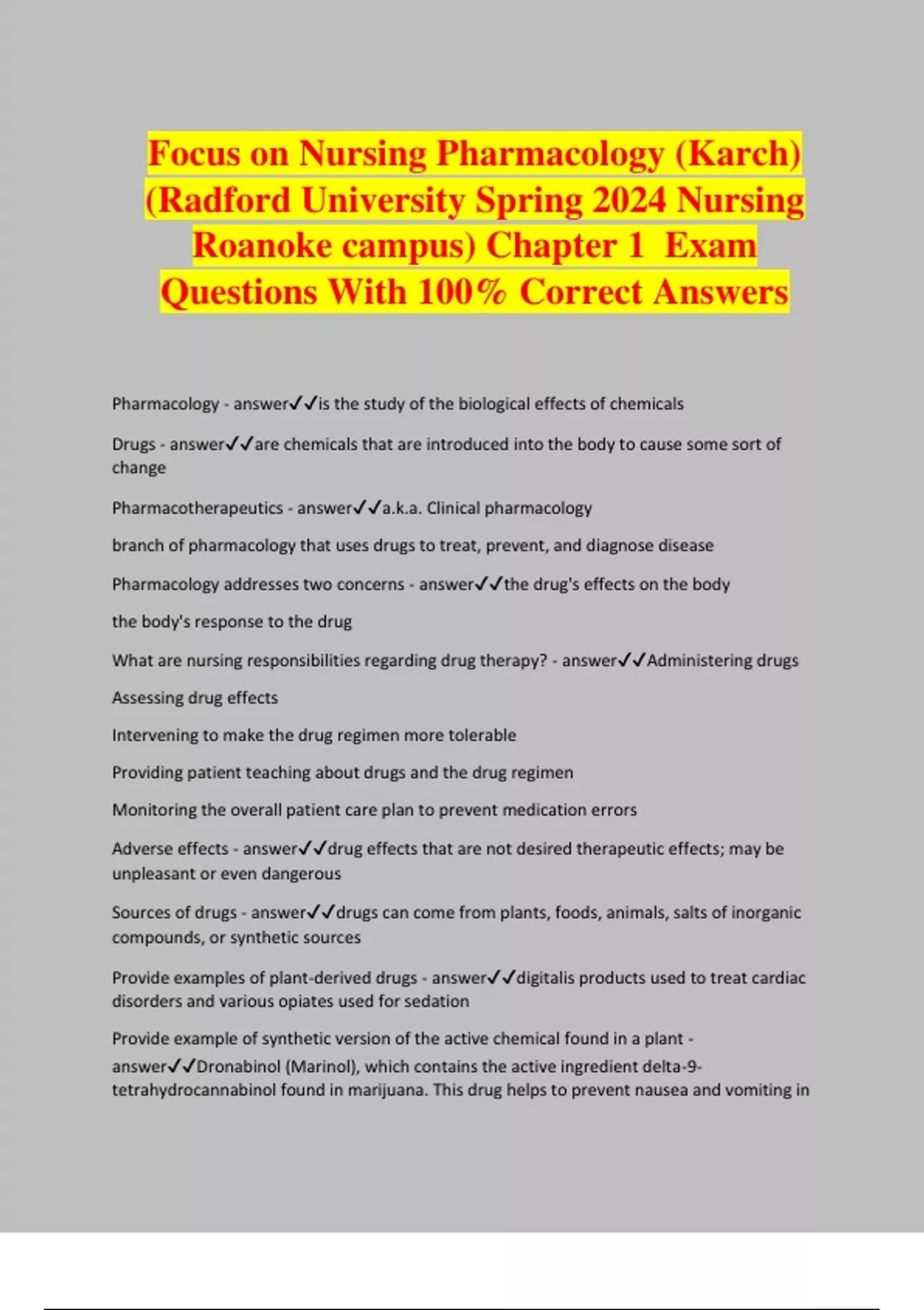 Focus on Nursing Pharmacology (Karch) (Radford University Spring 2024 Nursing Roanoke campus) Chapter 1 Exam Questions With 100% Correct Answers Pharmacology - answeris the study of the biological effects of chemicals Drugs - answerare chemicals that are introduced into the body to cause some sort of change Pharmacotherapeutics - answera.k.a. Clinical pharmacology branch of pharmacology that uses drugs to treat, prevent, and diagnose disease Pharmacology addresses two concerns - answerthe drug's effects on the body the body's response to the drug What are nursing responsibilities regarding drug therapy? - answerAdministering drugs Assessing drug effects Intervening to make the drug regimen more tolerable Providing patient teaching about drugs and the drug regimen Monitoring the overall patient care plan to prevent medication errors Adverse effects - answerdrug effects that are not desired therapeutic effects; may be unpleasant or even dangerous Sources of drugs - answerdrugs can come from plants, foods, animals, salts of inorganic compounds, or synthetic sources Provide examples of plant-derived drugs - answerdigitalis products used to treat cardiac disorders and various opiates used for sedation Provide example of synthetic version of the active chemical found in a plant - answerDronabinol (Marinol), which contains the active ingredient delta-9- tetrahydrocannabinol found in marijuana. This drug helps to prevent nausea and vomiting in cancer patients but does not have all of the adverse effects that occur when marijuana leaf is smoked. The synthetic version of the active ingredient allows for an accepted form to achieve the desired therapeutic effect in cancer patients. Provide example of how ingestion of plant-derived foods can sometimes lead to a drug effect - answerthe body converts licorice to a false aldosterone-a hormone found in the body- resulting in fluid retention and hypokalemia or low serum potassium levels if large amounts of licorice are eaten Inorganic compounds/ elements used for their therapeutic effects - answer*Aluminum* = (1)antacid to decrease gastric acidity (2) management of hyperphosphotemia (3) prevention of the formation of phosphate urinary stones *Fluorine* = (1) prevention of dental cavities (2) prevention of osteoporosis *Gold* = treatment of rheumatoid arthritis *Iron* = treatment of iron deficiency anemia Genetic engineering - answerprocess of altering DNA, usually of bacteria to produce a chemical to be used as a drug e.g. production of human insulin by altering Escherichia coli bacteria, making insulin a better product without some of the impurities that come with animal products. Thyroid drugs and growth hormone preparations are not created synthetically Food and Drug Administration (FDA) - answerfederal agency responsible for the regulation and enforcement of development and sale of drugs. FDA regulated tests are designed to ensure the safety and reliability of any drug approved in this country. Preclinical trials - answerinitial trial of a chemical thought to have therapeutic potential; uses laboratory animals, not human subjects PURPOSE: - to determine whether they have the presumed effects in living tissue - to evaluate any adverse effects Why are some chemicals discarded at the end of preclinical trials? - answer* the chemical lacks therapeutic activity when used with living animals * the chemical is *too toxic to living animals* to be worth the risk of developing into a drug * the chemical is highly teratogenic (causing adverse effects to the fetus) * the safety margins are so small that the chemical would not be useful in the clinical setting Phase I study - answera pilot study of a potential drug done with a small number of selected, healthy human male volunteers - studies are more tightly controlled than preclinical trials - performed by specially trained clinical investigators - women are not selected , too much risk is involved in taking a drug that might destroy or alter the ova DRUGS DRopped at the end of Phase I due to : 1) lack therapeutic activity in humans 2) are too toxic 3) produce unacceptable side effects Phase II study - answera clinical study of a proposed drug by selected physicians using actual patients who have the disorder the drug is designed to treat; patients must provide informed consent DRUGS REMOVED due to: (1) less effective than anticipated (2) are too toxic (3) Produce unacceptable side effects (4) have a low benefit-to-risk ratio (5) are not as effective as available drugs Phase III study - answeruse of a proposed drug on a wide scale in the clinical setting with patients who have the disease the drug is thought to treat DRUGS are removed if : (1) produce unacceptable side effects (2) produce unexpected responses Phase IV study - answercontinual evaluation of a drug after it has been released for marketing Brand name - answername given to the drug by the pharmaceutical company that developed it, aka trade name BRAND NAME IS ALWAYS ITALICIZED Generic name - answerthe original designation that a drug is given when the drug company that developed it applies for the approval process Generic drugs - answerdrugs sold by their generic name; not brand or trade name products Chemical names - answerare names that reflect the chemical structure of a drug what is FDA's primary concern in drug approval? - answerpublic safety Bonus Q (D2L): Drug label identifies the brand and generic names for the drug, the drug dosage, the expiration date, and sp