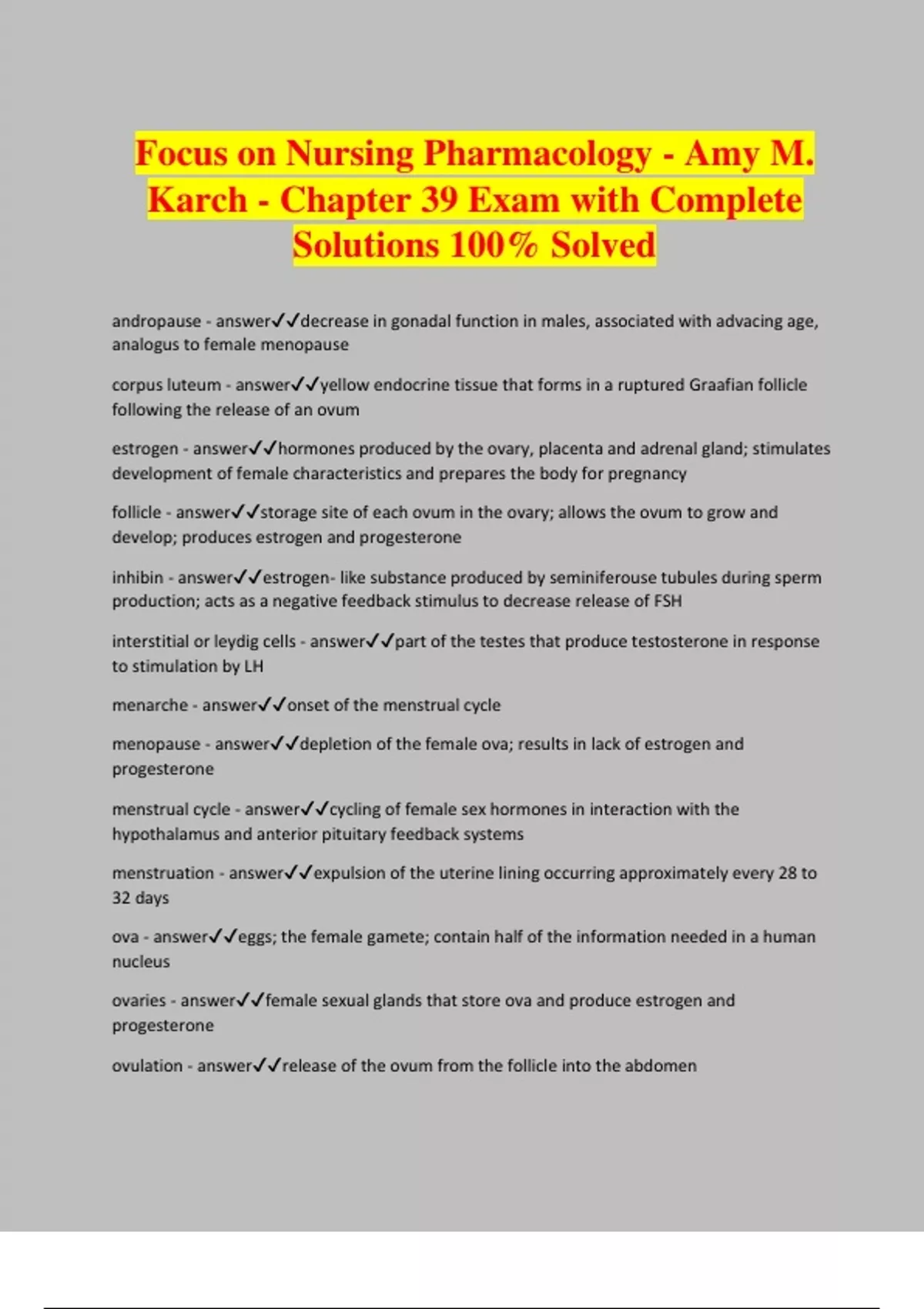 Focus on Nursing Pharmacology - Amy M. Karch - Chapter 39 Exam with Complete Solutions 100% Solved andropause - answerdecrease in gonadal function in males, associated with advacing age, analogus to female menopause corpus luteum - answeryellow endocrine tissue that forms in a ruptured Graafian follicle following the release of an ovum estrogen - answerhormones produced by the ovary, placenta and adrenal gland; stimulates development of female characteristics and prepares the body for pregnancy follicle - answerstorage site of each ovum in the ovary; allows the ovum to grow and develop; produces estrogen and progesterone inhibin - answerestrogen- like substance produced by seminiferouse tubules during sperm production; acts as a negative feedback stimulus to decrease release of FSH interstitial or leydig cells - answerpart of the testes that produce testosterone in response to stimulation by LH menarche - answeronset of the menstrual cycle menopause - answerdepletion of the female ova; results in lack of estrogen and progesterone menstrual cycle - answercycling of female sex hormones in interaction with the hypothalamus and anterior pituitary feedback systems menstruation - answerexpulsion of the uterine lining occurring approximately every 28 to 32 days ova - answereggs; the female gamete; contain half of the information needed in a human nucleus
