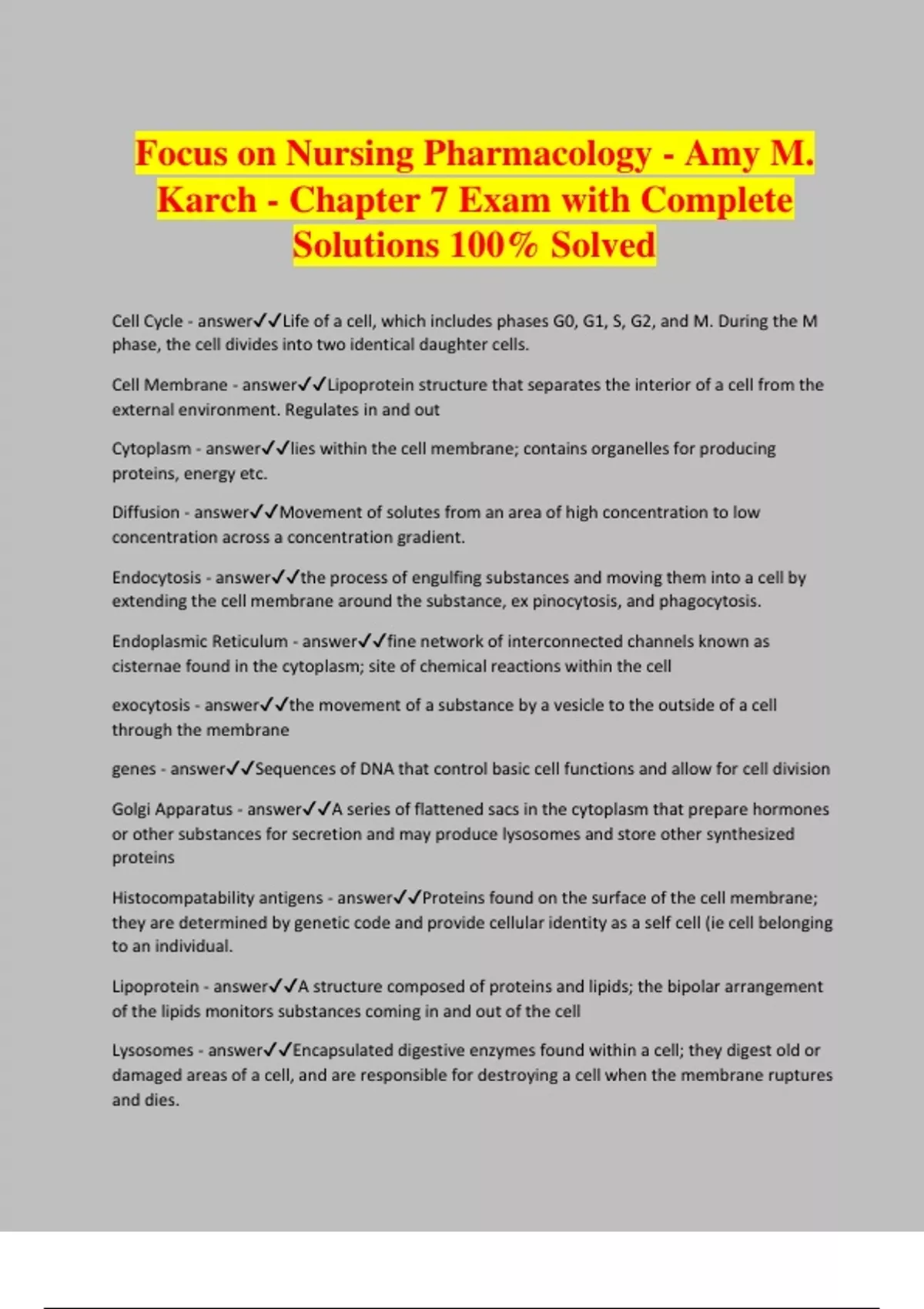 Focus on Nursing Pharmacology - Amy M. Karch - Chapter 7 Exam with Complete Solutions 100% Solved Cell Cycle - answerLife of a cell, which includes phases G0, G1, S, G2, and M. During the M phase, the cell divides into two identical daughter cells. Cell Membrane - answerLipoprotein structure that separates the interior of a cell from the external environment. Regulates in and out Cytoplasm - answerlies within the cell membrane; contains organelles for producing proteins, energy etc. Diffusion - answerMovement of solutes from an area of high concentration to low concentration across a concentration gradient. Endocytosis - answerthe process of engulfing substances and moving them into a cell by extending the cell membrane around the substance, ex pinocytosis, and phagocytosis. Endoplasmic Reticulum - answerfine network of interconnected channels known as cisternae found in the cytoplasm; site of chemical reactions within the cell exocytosis - answerthe movement of a substance by a vesicle to the outside of a cell through the membrane genes - answerSequences of DNA that control basic cell functions and allow for cell division
