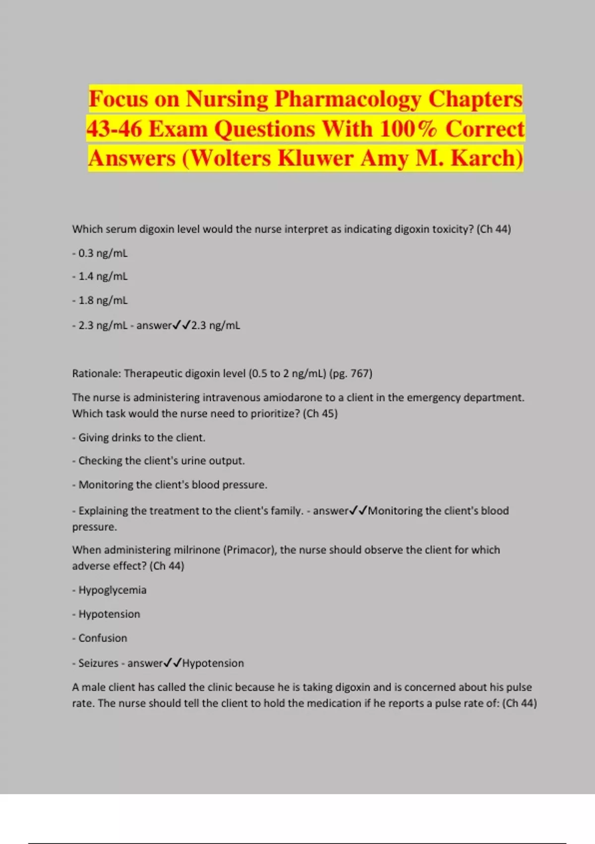 Focus on Nursing Pharmacology Chapters 43-46 Exam Questions With 100% Correct Answers (Wolters Kluwer Amy M. Karch) Which serum digoxin level would the nurse interpret as indicating digoxin toxicity? (Ch 44) - 0.3 ng/mL - 1.4 ng/mL - 1.8 ng/mL - 2.3 ng/mL - answer2.3 ng/mL Rationale: Therapeutic digoxin level (0.5 to 2 ng/mL) (pg. 767) The nurse is administering intravenous amiodarone to a client in the emergency department. Which task would the nurse need to prioritize? (Ch 45) - Giving drinks to the client. - Checking the client's urine output. - Monitoring the client's blood pressure. - Explaining the treatment to the client's family. - answerMonitoring the client's blood pressure. When administering milrinone (Primacor), the nurse should observe the client for which adverse effect? (Ch 44) - Hypoglycemia - Hypotension - Confusion - Seizures - answerHypotension A male client has called the clinic because he is taking digoxin and is concerned about his pulse rate. The nurse should tell the client to hold the medication if he reports a pulse rate of: (Ch 44) - 52 beats per minute - 66 beats per minute - 78 beats per minute - 84 beats per minute - answer52 beats per minute Rationale: Hold the dose if the pulse is less than 60 beats/min in an adult or 90 beats/min in an infant; retake the pulse in 1 hour. If the pulse remains low, pulse should be documented, drug should be withheld, and the prescriber should be notified because the pulse rate could indicate digoxin toxicity. (pg. 767) A client has been prescribed losartan (Cozaar) for hypertension. What should client teaching for this drug include? (Ch 43) - Limit fluid intake to decrease urinary output. - Take the drug early in the day to prevent sleepiness. - Take the medication with food to decrease GI distress. - Take the drug on an empty stomach to limit absorption. - answerTake the medication with food to decrease GI distress. There are adverse effects to many medications. What anti arrhythmic agents can cause insomnia? (Ch 45) - Disopyramide - Procainamide - Amiodarone - Propranolol - answerPropranolol A client using a nitroglycerin patch should avoid: (Ch 46) - Exercise - Milk products - Synthetic fabrics - Alcoholic beverages - answerAlcoholic beverages A client is receiving verapamil. What would be important for the nurse to stress that the client avoid? - Milk - Yogurt - Apple juice - Grapefruit juice - answerGrapefruit juice A client should be instructed to take sublingual nitroglycerin (NTG) how often if he experiences chest pain? (Ch 46) - Every 1 minute times 3 - Every 2 minutes times 3 - Every 5 minutes times 3 - Every 10 minutes times 5 - answerEvery 5 minutes times 3 Rationale: One tablet SL every 5 min for acute attack, up to three tablets in 15 minutes (pg 796, Box 46.1) The nurse should inform the client of the possibility of developing what the common adverse effect of captopril therapy? (Ch 43) - Rhinitis - Dry cough - Photosensitivity - Rash on the trunk and extremities - answerDry cough Rationale: Captopril may produce a persistent, dry cough that is not serious. (pg. 741) Clients may want to discontinue therapy because of the cough. Thorough patient teaching increases the efficacy of drug therapy and patient compliance; therefore, informing the client about the possibility of developing a dry cough is imperative. The nurse is administering sublingual nitroglycerin to a client. Prior to administering the medication, the nurse informs the client that immediately after administration, the client may experience: (Ch 46) - Tinnitus and diplopia - Nervousness and paresthesia - Drowsiness and blurred vision
