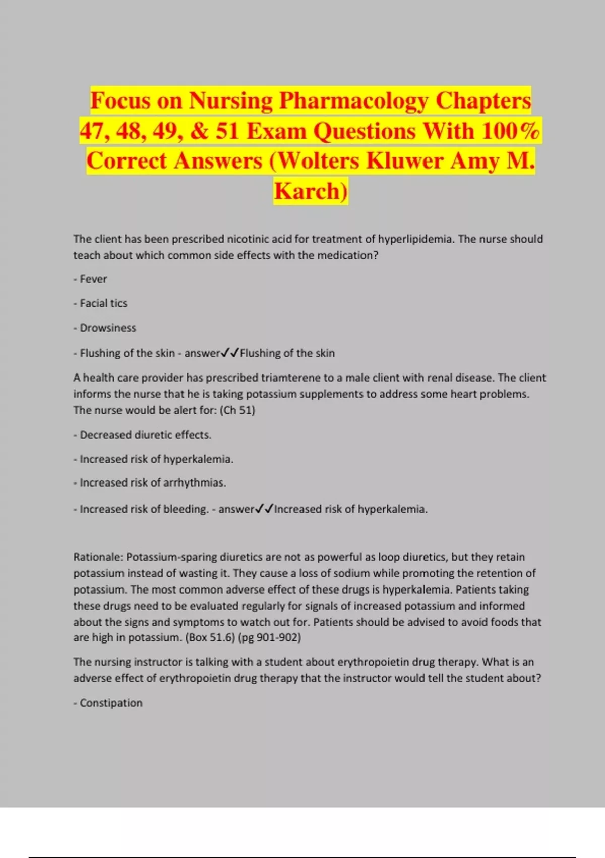 Focus on Nursing Pharmacology Chapters 47, 48, 49, & 51 Exam Questions With 100% Correct Answers (Wolters Kluwer Amy M. Karch) The client has been prescribed nicotinic acid for treatment of hyperlipidemia. The nurse should teach about which common side effects with the medication? - Fever - Facial tics - Drowsiness - Flushing of the skin - answerFlushing of the skin A health care provider has prescribed triamterene to a male client with renal disease. The client informs the nurse that he is taking potassium supplements to address some heart problems. The nurse would be alert for: (Ch 51) - Decreased diuretic effects. - Increased risk of hyperkalemia. - Increased risk of arrhythmias. - Increased risk of bleeding. - answerIncreased risk of hyperkalemia. Rationale: Potassium-sparing diuretics are not as powerful as loop diuretics, but they retain potassium instead of wasting it. They cause a loss of sodium while promoting the retention of potassium. The most common adverse effect of these drugs is hyperkalemia. Patients taking these drugs need to be evaluated regularly for signals of increased potassium and informed about the signs and symptoms to watch out for. Patients should be advised to avoid foods that are high in potassium. (Box 51.6) (pg 901-902) The nursing instructor is talking with a student about erythropoietin drug therapy. What is an adverse effect of erythropoietin drug therapy that the instructor would tell the student about? - Constipation - Hypotension - Depression - Edema - answerEdema The clinic nurse has been assigned to a 43-year-old client who is obese and loves to eat. The client has been diagnosed with hyperlipidemia and has been prescribed lovastatin. Which dietary instruction would be a priority for the nurse to discuss with the client? (Ch 47) - Increase intake of fatty acids. - Avoid drinking grapefruit juice. - Decrease intake of plant stanols. - Increase intake of milk and dairy products. - answerAvoid drinking grapefruit juice. Rationale: HMG-CoA reductase inhibitors block HMG-CoA reductase from completing the synthesis of cholesterol. This blocks the early rate-limiting step in the synthesis of cellular cholesterol that involves the enzyme HMG-CoA. Thus, serum cholesterol and LDL levels decrease because more LDLs are absorbed by the cells for processing into cholesterol. In contrast, HDL levels increase slightly with this alteration in fat metabolism. (pg 821) Patients who are taking HMG-CoA inhibitors need to be cautioned to avoid drinking grapefruit juice while taking these drugs. Grapefruit juice alters the metabolism of the drugs, leading to an increased risk for adverse effects, such as the potentially fatal rhabdomyolysis with renal failure. The metabolism of the components of grapefruit juice takes about 48 hours . Since the effects may last for several days, just drinking grapefruit juice at a different time of the day does not protect the patient from risk. (pg 823, Box 47.7) A 22-year-old female who has severe dysmenorrhea has been prescribed ferrous gluconate (Fergon) to treat iron deficiency anemia. What is important for the nurse to instruct the client to avoid when taking the drug? - Eggs - Pork - Chocolate - Whole wheat - answerEggs A 22-year-old female client is seen in the primary care provider's office for a follow-up visit. Six weeks ago she was diagnosed with iron deficiency anemia and has been taking the prescribed iron supplement. She noticed that her stool has turned black. She tells the nurse she fears that she is bleeding to death inside her belly. The nurse teaches the client about which expected outcome? (Ch 49) - "Iron supplements cannot cause bleeding." - "Black stool is not a sign of internal bleeding." - "Iron supplements may cause bleeding, but this is nothing to worry about." - "Iron supplements can cause black or dark stools because of the iron composition." - answer"Iron supplements can cause black or dark stools because of the iron composition." Rationale: The iron preparations stain the stools; the color remains as long as you are taking the drug and should not cause concern. The most common adverse effects associated with oral iron are related to direct GI irritation. (pg 871) The nurse is teaching a male client who has just been prescribed a bile acid sequestrate. The nurse teaches the client that he may mix his lipid-lowering agent with a carbonated beverage. What bile acid sequestrant is the client taking? - Cholestyramine (Questrant) - Colesevelam (Colestid) - Colestipol (Colestid) - Ezetimibe (Zetia) - answerColestipol (Colestid) What is an example of a loop diuretic? (Ch 51) - Furosemide (Lasik) - Chlorothiazide (Diuril) - Acetazolamide (Diamox) - Spironolactone (Aldactone) - answerFurosemide (Lasik) Rationale: Furosemide is a loop diuretic. Chlorothiazide is a thiazide diuretic. Acetazolamide is a carbonic anhydrase inhibitor. Spironolactone is a potassium-sparing diuretic. (pg 890) A client has been diagnosed with chronic renal failure. Which medication will assist in raising the client's hemoglobin levels? - Estazolam - Epoetin alfa