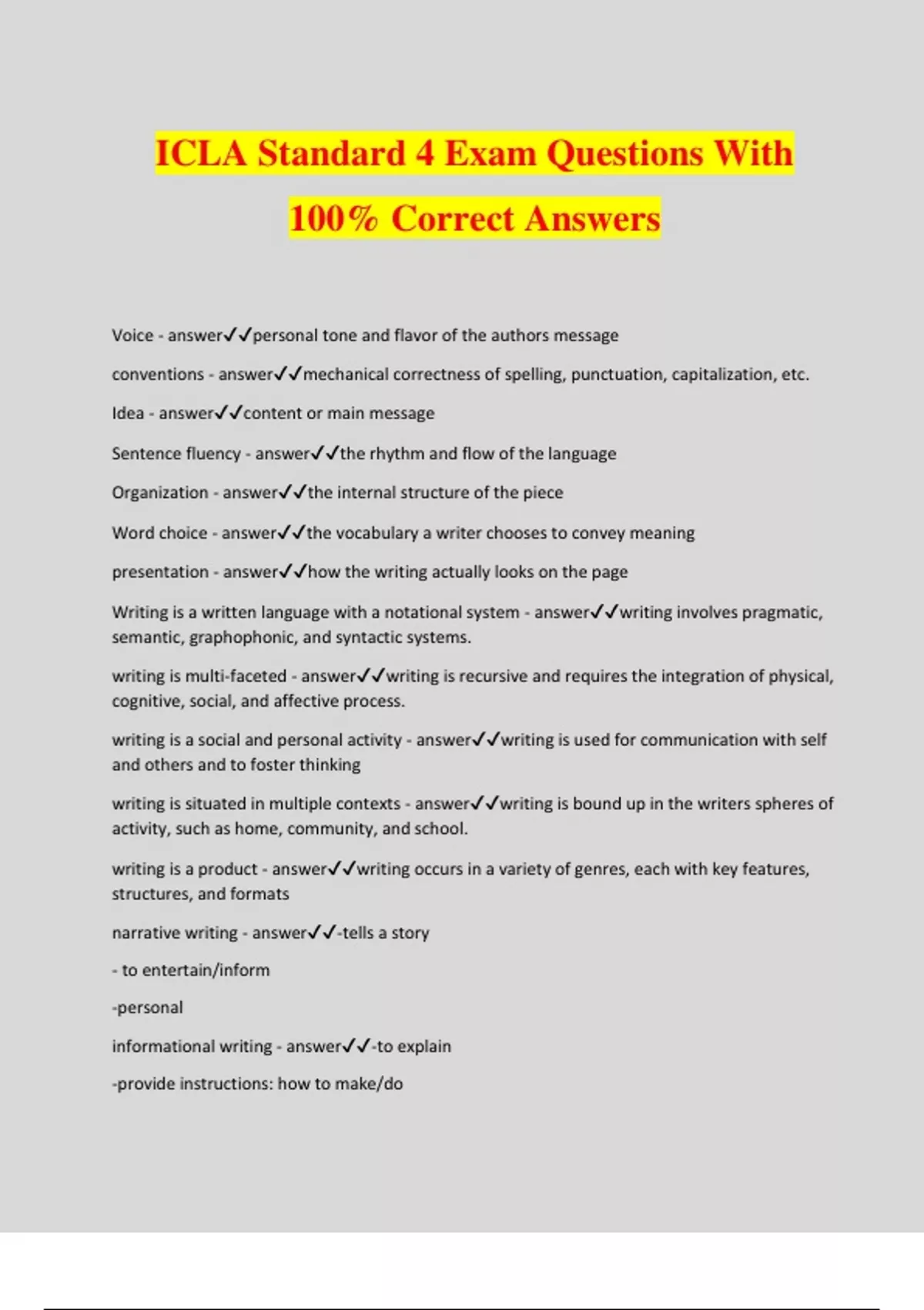 ICLA Standard 4 Exam Questions With 100% Correct Answers Voice - answerpersonal tone and flavor of the authors message conventions - answermechanical correctness of spelling, punctuation, capitalization, etc. Idea - answercontent or main message Sentence fluency - answerthe rhythm and flow of the language Organization - answerthe internal structure of the piece Word choice - answerthe vocabulary a writer chooses to convey meaning presentation - answerhow the writing actually looks on the page Writing is a written language with a notational system - answerwriting involves pragmatic, semantic, graphophonic, and syntactic systems. writing is multi-faceted - answerwriting is recursive and requires the integration of physical, cognitive, social, and affective process. writing is a social and personal activity - answerwriting is used for communication with self and others and to foster thinking writing is situated in multiple contexts - answerwriting is bound up in the writers spheres of activity, such as home, community, and school. writing is a product - answerwriting occurs in a variety of genres, each with key features, structures, and formats narrative writing - answer-tells a story - to entertain/inform -personal informational writing - answer-to explain -provide instructions: how to make/do