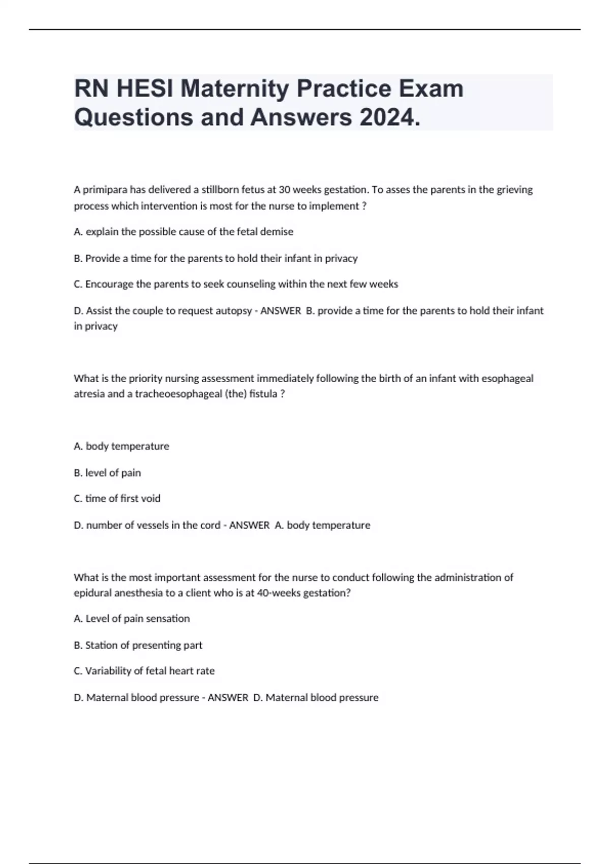 RN HESI Maternity Practice Exam Questions and Answers 2024. A primipara has delivered a stillborn fetus at 30 weeks gestation. To asses the parents in the grieving process which intervention is most for the nurse to implement ? A. explain the possible cause of the fetal demise B. Provide a time for the parents to hold their infant in privacy C. Encourage the parents to seek counseling within the next few weeks D. Assist the couple to request autopsy B. provide a time for the parents to hold their infant in privacy What is the priority nursing assessment immediately following the birth of an infant with esophageal atresia and a tracheoesophageal (the) fistula ? A. body temperature B. level of pain C. time of first void D. number of vessels in the cord A. body temperature What is the most important assessment for the nurse to conduct following the administration of epidural anesthesia to a client who is at 40-weeks gestation? A. Level of pain sensation B. Station of presenting part C. Variability of fetal heart rate D. Maternal blood pressure D. Maternal blood pressure A 34-week primigravida with pregnancy induced hypertension (PIH) is receiving Ringer's Lactate 500 ml with magnesium sulfate 20 grams at the rate of 3 grams/hour. How many ml/hour should the nurse program the infusion pump? (Enter numeric value only) A. 120 B. 70 C. 65 D. 75 D. 75
