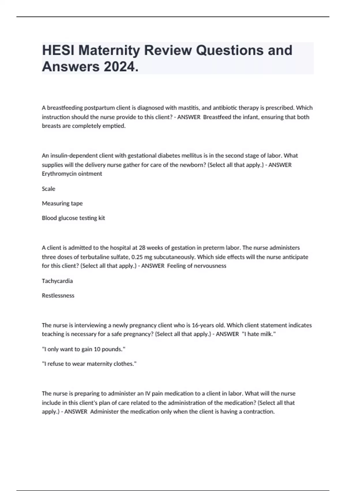 HESI Maternity Review Questions and Answers 2024. A breastfeeding postpartum client is diagnosed with mastitis, and antibiotic therapy is prescribed. Which instruction should the nurse provide to this client? Breastfeed the infant, ensuring that both breasts are completely emptied. An insulin-dependent client with gestational diabetes mellitus is in the second stage of labor. What supplies will the delivery nurse gather for care of the newborn? (Select all that apply.) Erythromycin ointment Scale Measuring tape Blood glucose testing kit A client is admitted to the hospital at 28 weeks of gestation in preterm labor. The nurse administers three doses of terbutaline sulfate, 0.25 mg subcutaneously. Which side effects will the nurse anticipate for this client? (Select all that apply.) Feeling of nervousness Tachycardia Restlessness The nurse is interviewing a newly pregnancy client who is 16-years old. Which client statement indicates teaching is necessary for a safe pregnancy? (Select all that apply.) "I hate milk." "I only want to gain 10 pounds." "I refuse to wear maternity clothes."
