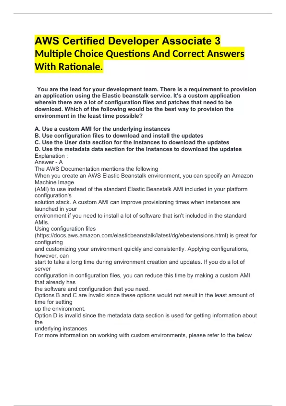 AWS Certified Developer Associate 3 Multiple Choice Questions And Correct Answers With Rationale. You are the lead for your development team. There is a requirement to provision an application using the Elastic beanstalk service. It's a custom application wherein there are a lot of configuration files and patches that need to be download. Which of the following would be the best way to provision the environment in the least time possible? A. Use a custom AMI for the underlying instances B. Use configuration files to download and install the updates C. Use the User data section for the Instances to download the updates D. Use the metadata data section for the Instances to download the updates Explanation : Answer - A The AWS Documentation mentions the following When you create an AWS Elastic Beanstalk environment, you can specify an Amazon Machine Image (AMI) to use instead of the standard Elastic Beanstalk AMI included in your platform configuration's solution stack. A custom AMI can improve provisioning times when instances are launched in your environment if you need to install a lot of software that isn't included in the standard AMIs. Using configuration files ( and customizing your environment quickly and consistently. Applying configurations, however, can start to take a long time during environment creation and updates. If you do a lot of server configuration in configuration files, you can reduce this time by making a custom AMI that already has the software and configuration that you need. Options B and C are invalid since these options would not result in the least amount of time for setting up the environment. Option D is invalid since the metadata data section is used for getting information about the underlying instances For more information on working with custom environments, please refer to the below URL A development team is developing a mobile based application. They want to use AWS services for data storage and for managing authentication. It also needs to be ensured that a second level of authentication is available for users. Which of the following would assist in this? Choose 2 answers from the options given below A. Use the AWS Cognito Service B. Use the AWS Config Service C. Enable MFA for the underlying user pool D. Enable user names and passwords for the underlying user pools Explanation : Answer - A and C The AWS Documentation mentions the following Amazon Cognito provides authentication, authorization, and user management for your web and mobile apps. Your users can sign in directly with a user name and password, or through a third party such as Facebook, Amazon, or Google. Multi-factor authentication (MFA) increases security for your app by adding another authentication method, and not relying solely on user name and password. You can choose to use SMS text messages, or time-based one-time (TOTP) passwords as second factors in signing in your users. Option B is invalid since this is a configuration service Option D is invalid since user names and passwords is not a valid second level of authentication For more information on MFA with AWS Cognito, please refer to the below URL Your development team is working with Docker containers. These containers need to encrypt data. The data key needs to be generated using the KMS service. The data key should be in the encrypted format. Which of the following would you most ideally use? A. The GenerateDataKey command B. The GenerateDataKeyWithoutPlaintext command C. Use the CMK Keys D. Use client-side keys Explanation : Answer - B The AWS Documentation mentions the following Returns a data encryption key encrypted under a customer master key (CMK). This operation is identical to GenerateDataKey ( only the encrypted copy of the data key. Option A is invalid since this also returns a plain text key as well Option C is invalid since you should not use the CMK keys for encrypting data Option D is invalid since the question states that you need to use the KMS service For more information on Generating data keys, please refer to the below URL Your development team is developing several Lambda functions for testing. These functions will be called by a single .Net program. The program needs to call each Lambda function in a sequential manner for testing purposes. How can you accomplish this in the easiest way to ensure that least changes need to be made to the .Net program to call the various Lambda functions? A. Create different environment variables for the Lambda function B. Create different versions for the Lambda function C. Create an ALIAS and reference is in the program D. Use the SAM for deployment of the functions Explanation : Answer - C The AWS Documentation mentions the following You can create one or more aliases for your Lambda function. An AWS Lambda alias is like a pointer to a specific Lambda function version. By using aliases, you can access the Lambda function an alias is pointing to (for example, to invoke the function) without the caller having to know the specific version the alias is pointing to Option A is invalid since environment variables in AWS Lambda are used to dynamically pass settings to your function code and libraries, without making changes to the Lambda code. Option B is invalid since this is used to publish one or more versions of your Lambda function Option D is invalid since this is used to define serverless applications For more information on ALIAS, please refer to the below URL You are starting to develop an application using AWS services. You are testing the services out by querying them using REST API. Which of the following would be needed to make successful calls to AWS services using REST API A. User name and password B. SSL certificates C. Access Keys D. X.509 certificates Explanation : Answer - C The AWS Documentation mentions the following Access keys consist of an access key ID (for example, AKIAIOSFODNN7EXAMPLE) and a secret access key (for example, wJalrXUtnFEMI/K7MDENG/bPxRfiC