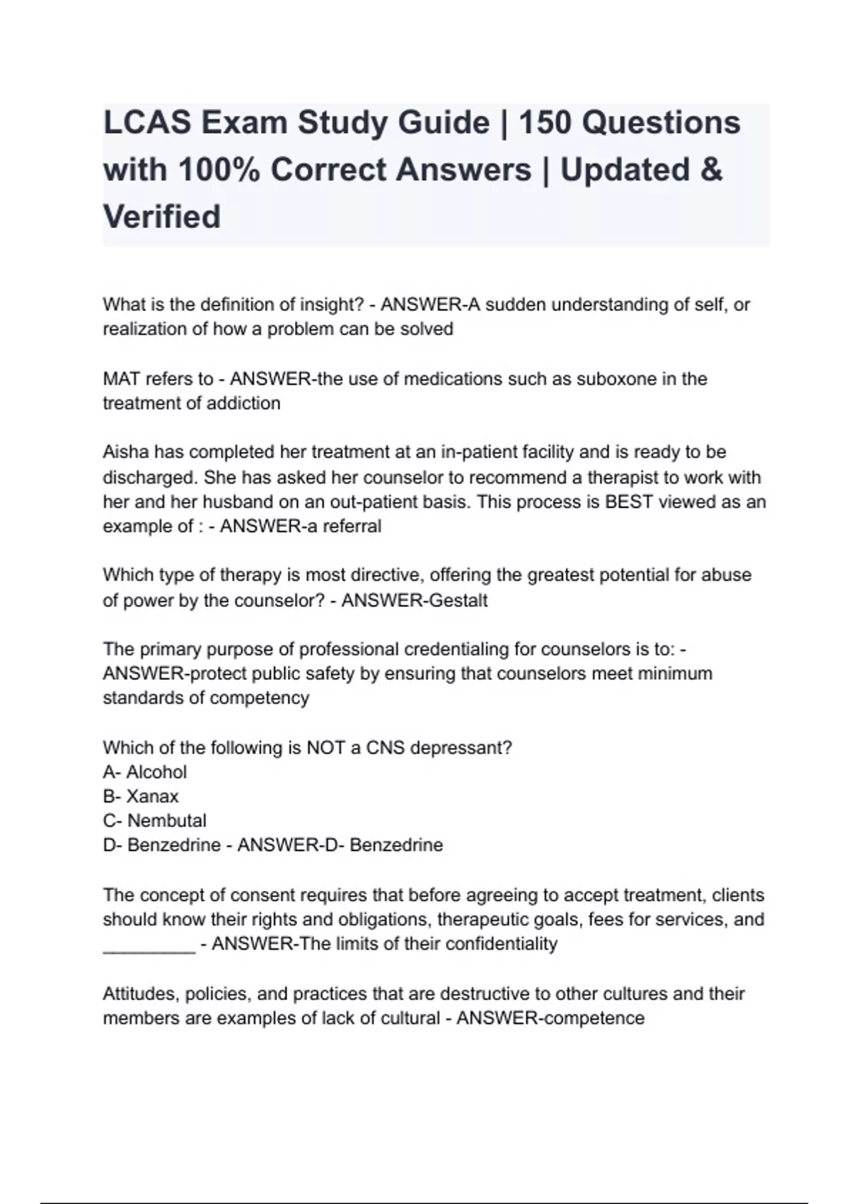LCAS Exam Study Guide | 150 Questions with 100% Correct Answers | Updated & Verified What is the definition of insight? - ANSWER-A sudden understanding of self, or realization of how a problem can be solved MAT refers to - ANSWER-the use of medications such as suboxone in the treatment of addiction Aisha has completed her treatment at an in-patient facility and is ready to be discharged. She has asked her counselor to recommend a therapist to work with her and her husband on an out-patient basis. This process is BEST viewed as an example of : - ANSWER-a referral Which type of therapy is most directive, offering the greatest potential for abuse of power by the counselor? - ANSWER-Gestalt The prim