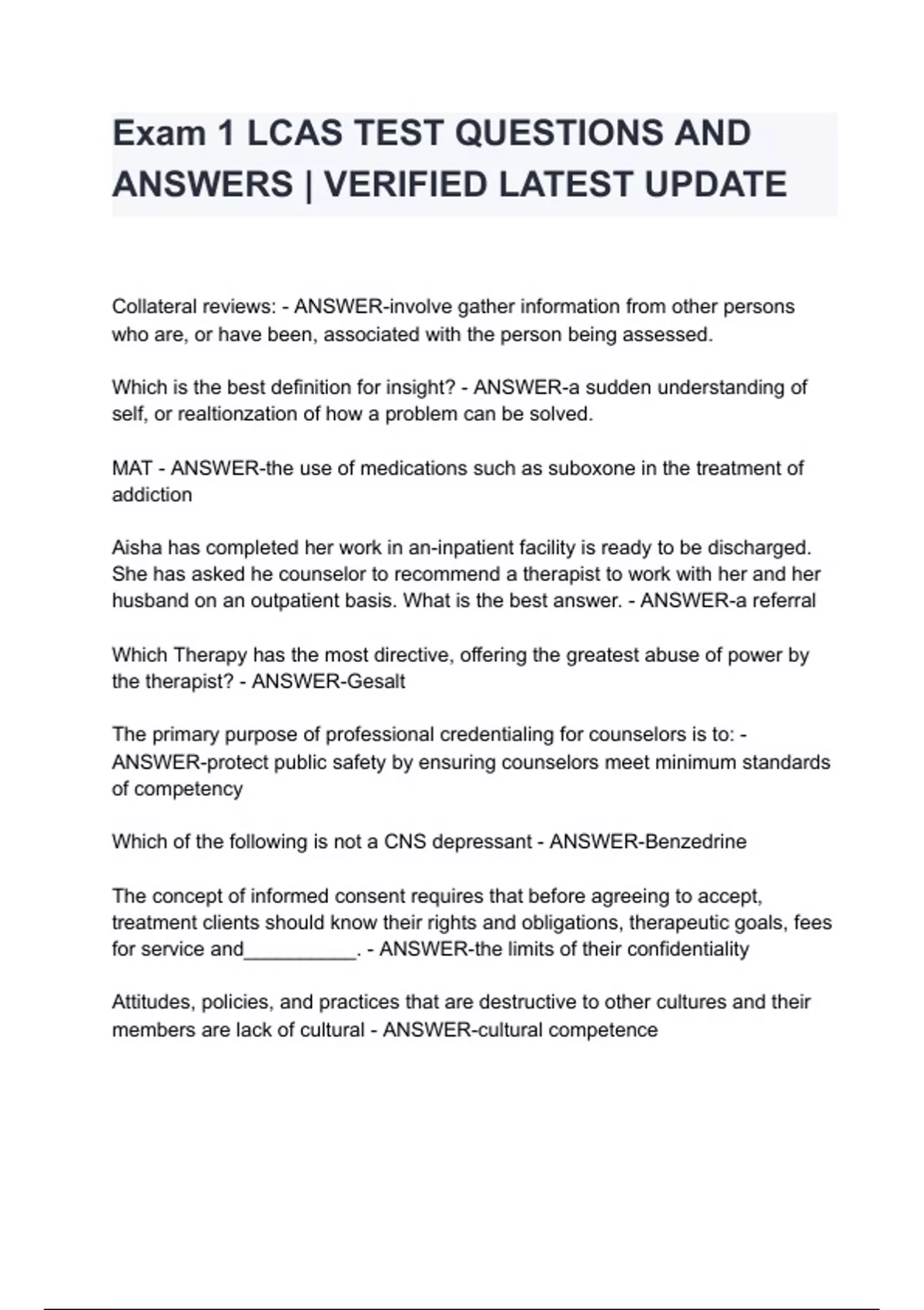 Exam 1 LCAS TEST QUESTIONS AND ANSWERS | VERIFIED LATEST UPDATE Collateral reviews: - ANSWER-involve gather information from other persons who are, or have been, associated with the person being assessed. Which is the best definition for insight? - ANSWER-a sudden understanding of self, or realtionzation of how a problem can be solved. MAT - ANSWER-the use of medications such as suboxone in the treatment of addiction Aisha has completed her work in an-inpatient facility is ready to be discharged. She has asked he counselor to recommend a therapist to work with her and her husband on an outpatient basis. What is the best answer. - ANSWER-a referral Which Therapy has the most directive, offering the greatest abuse of power by the therapist? - ANSWER-Gesalt The primary purpose of professional credentialing for counselors is to: - ANSWER-protect public safety by ensuring counselors meet minimum standards of competency Which of the following is not a CNS depressant - ANSWER-Benzedrine The concept of informed consent requires that before agreeing to accept, treatment clients should know their rights and obligations, therapeutic goals, fees for service and__________. - ANSWE