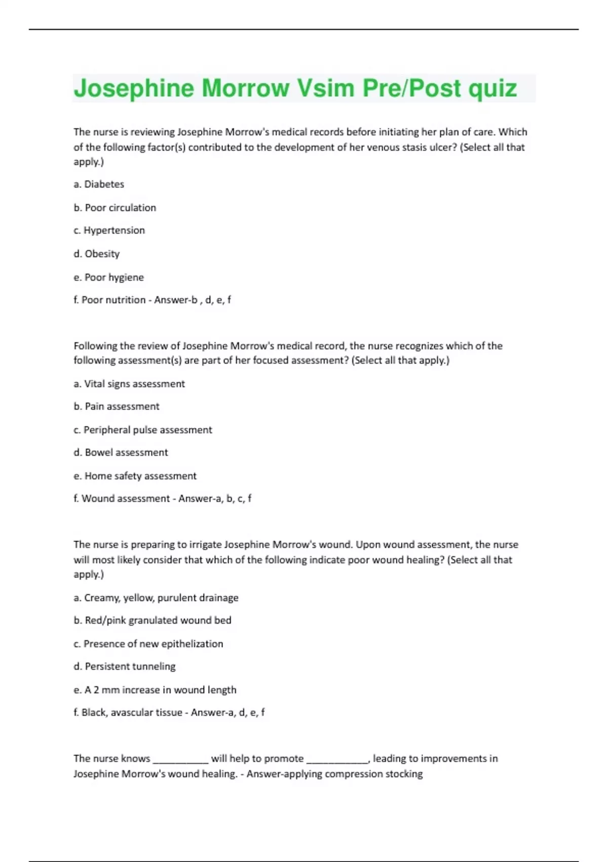 The nurse is reviewing Josephine Morrow's medical records before initiating her plan of care. Which of the following factor(s) contributed to the development of her venous stasis ulcer? (Select all that apply.) a. Diabetes b. Poor circulation c. Hypertension d. Obesity e. Poor hygiene f. Poor nutrition - Answer-b , d, e, f Following the review of Josephine Morrow's medical record, the nurse recognizes which of the following assessment(s) are part of her focused assessment? (Select all that apply.) a. Vital signs assessment b. Pain assessment c. Peripheral pulse assessment d. Bowel assessment e. Home safety assessment f. Wound assessment - Answer-a, b, c, f The nurse is preparing to irrigate Josephine Morrow's wound. Upon wound assessment, the nurse will most likely consider that which of the following indicate poor wound healing? (Select all that apply.) a. Creamy, yellow, purulent drainage b. Red/pink granulated wound bed c. Presence of new epithelization d. Persistent tunneling e. A 2 mm increase in wound length f. Black, avascular tissue - Answer-a, d, e, f The nurse knows __________ will help to promote ___________, leading to improvements in Josephine Morrow's wound healing. - Answer-applying compression stockingvenous return When performing wound irrigation, the nurse understands to include which of the following during implementation of the procedure? (Select all that apply.) a. Assess the client's pain level during irrigation. b. Irrigate from most to least contaminated area. c. Apply gown, gloves, and mask with goggles. d. Dry intact skin prior to applying dressing. e. Assess wound bed for appearance. f. Keep tip of syringe less than 1 inch from wound. - AnswerWhen performing wound irrigation, the nurse understands to include which of the following during implementation of the procedure? (Select all that apply.) a. Assess the client's pain level during irrigation. b. Irrigate from most to least contaminated area. c. Apply gown, gloves, and mask with goggles. d. Dry intact skin prior to applying dressing. e. Assess wound bed for appearance. f. Keep tip of syringe less than 1 inch from wound. - Answer-b, c, d, e