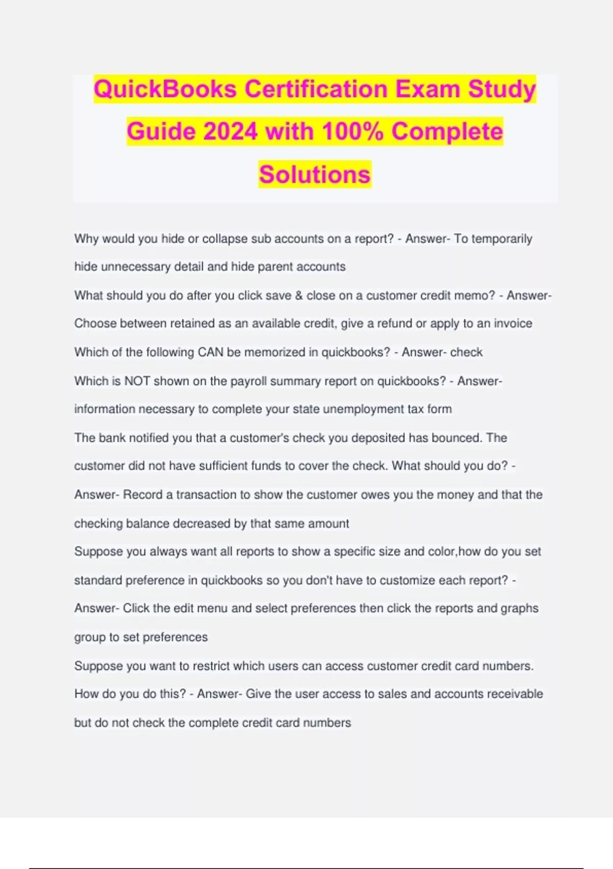 QuickBooks Certification Exam Study Guide 2024 with 100% Complete Solutions