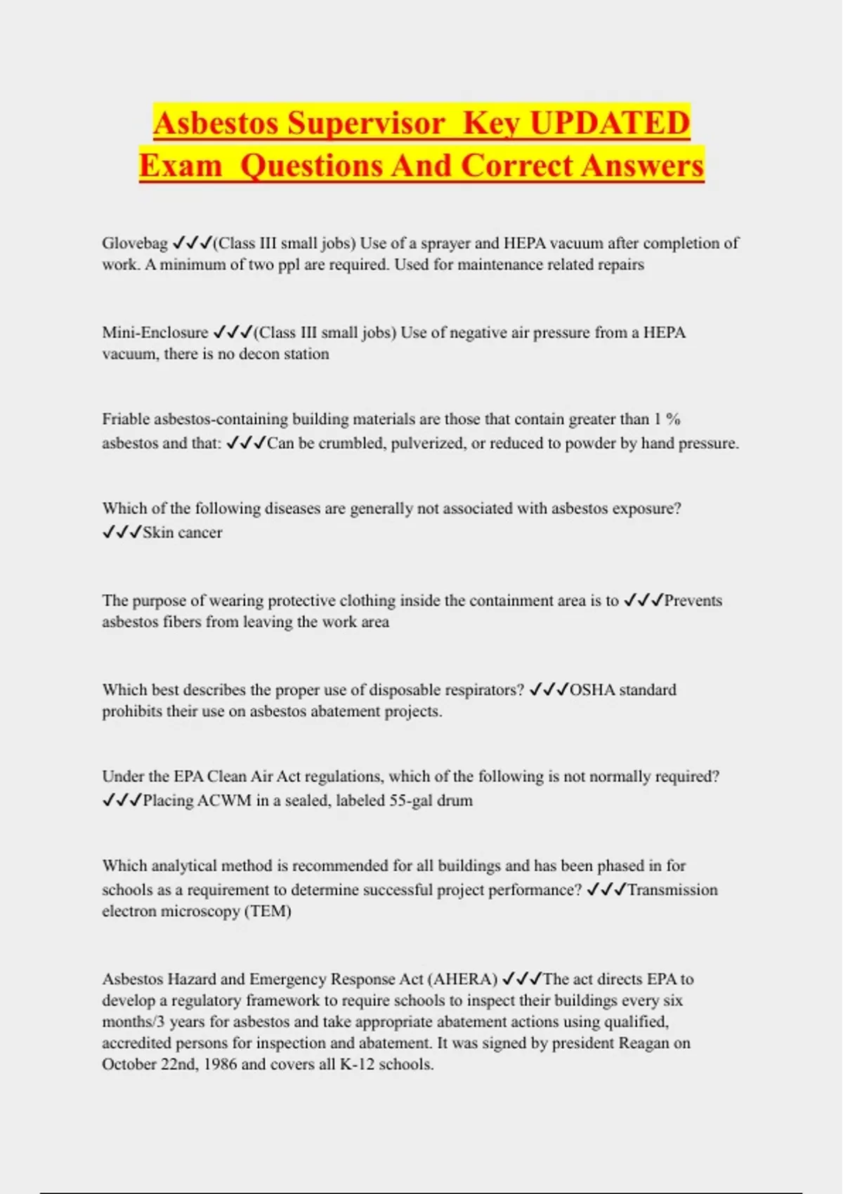 Asbestos Supervisor Key UPDATED Exam Questions And Correct Answers