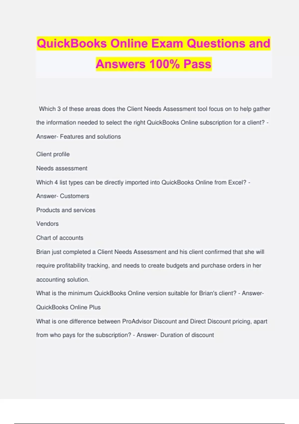 QuickBooks Online Exam Questions and Answers 100% Pass Which 3 of these areas does the Client Needs Assessment tool focus on to help gather the information needed to select the right QuickBooks Online subscription for a client? - Answer- Features and solutions Client profile Needs assessment Which 4 list types can be directly imported into QuickBooks Online from Excel? - Answer- Customers Products and services Vendors Chart of accounts Brian just completed a Client Needs Assessment and his client confirmed that she will require profitability tracking, and needs to create budgets and purchase orders in her accounting solution. What is the minimum QuickBooks Online version suitable for Brian's client? - Answer- QuickBooks Online Plus What is one difference between ProAdvisor Discount and Direct Discount pricing, apart from who pays for the subscription? - Answer- Duration of discount To determine the scope of a bookkeeping clean-up engagement, you are reviewing the Client Overview tab for a potential client. You notice that there is a large amount in the Opening Balance Equity account. Which 2 reasons could be causing this balance? - Answer- A reconciliation adjustment was posted when completing a bank reconciliation Transactions in the Banking Center were added without assigning an account to them When using QuickBooks Online Accountant, Diane Doolittle opens a client's QuickBooks Online company from her Client dashboard. Where can she see which apps are connected to the client's account without signing out of the account? - Answer- Overview > Company Setup Which menu area allows you to search for apps by the problem or business process they address? - Answer- Browse category Where are 2 places you can search for apps that work with QuickBooks Online? - Answer- Account and Settings > Apps How will QuickBooks notify you when subscribing to receive updates and resolutions on QuickBooks Online outages or slowdowns? - Answer- Email Where can you enable account numbers for the chart of accounts? - Answer- Gear icon > Account and Settings > Advanced > Chart of Accounts > Enable account numbers Which users will be able to see account numbers if they are enabled? - Answer- All users will see the account numbers. Before merging two sub-accounts, what do you need to check? - Answer- Make sure the names are spelled the same