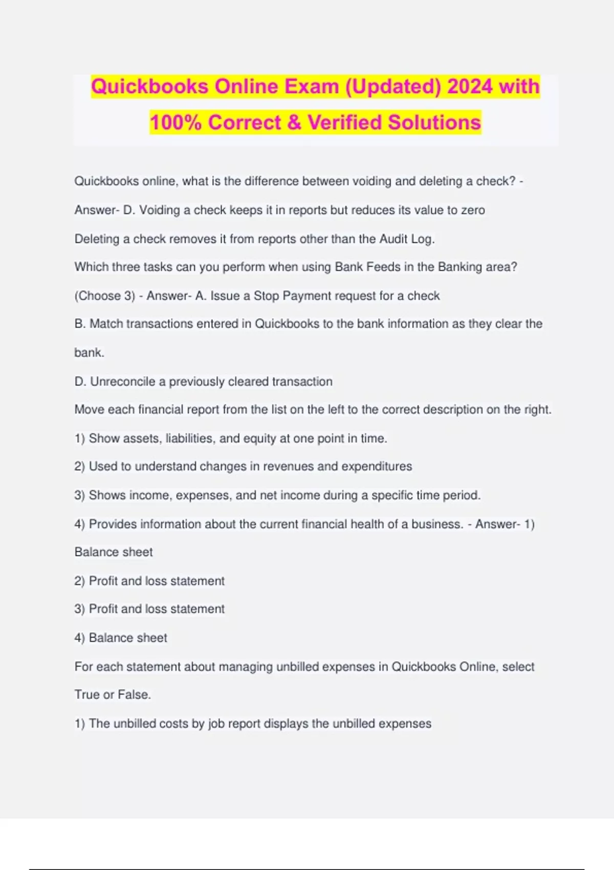 Quickbooks Online Exam (Updated) 2024 with 100% Correct & Verified Solutions Quickbooks online, what is the difference between voiding and deleting a check? - Answer- D. Voiding a check keeps it in reports but reduces its value to zero Deleting a check removes it from reports other than the Audit Log. Which three tasks can you perform when using Bank Feeds in the Banking area? (Choose 3) - Answer- A. Issue a Stop Payment request for a check B. Match transactions entered in Quickbooks to the bank information as they clear the bank. D. Unreconcile a previously cleared transaction Move each financial report from the list on the left to the correct description on the right. 1) Show assets, liabilities, and equity at one point in time. 2) Used to understand changes in revenues and expenditures 3) Shows income, expenses, and net income during a specific time period. 4) Provides information about the current financial health of a business. - Answer- 1) Balance sheet 2) Profit and loss statement 3) Profit and loss statement 4) Balance sheet For each statement about managing unbilled expenses in Quickbooks Online, select True or False. 1) The unbilled costs by job report displays the unbilled expenses 2) If you clear the billable check box for a cost, it is no longer a business expense. 3) You can change the billable status of a cost by selecting or clearing the Billable check box on the check. - Answer- 1) True 2) False 3) True For each aspect of a report, select YES is you can customize that aspect or No if you cannot. 1) The data range 2) The accounting 3) The way numbers are formatted - Answer- 1) Yes 2) Yes 3) No