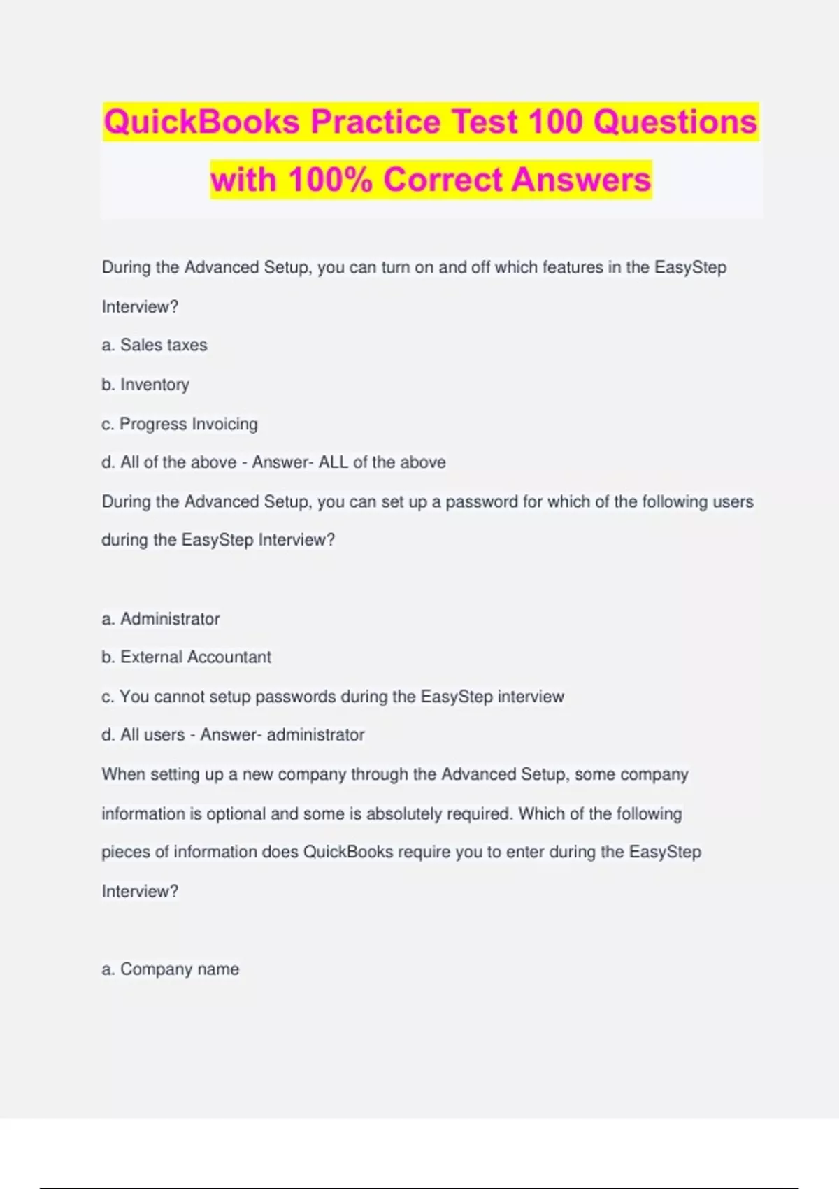 QuickBooks Practice Test 100 Questions with 100% Correct Answers During the Advanced Setup, you can turn on and off which features in the EasyStep Interview? a. Sales taxes b. Inventory c. Progress Invoicing d. All of the above - Answer- ALL of the above During the Advanced Setup, you can set up a password for which of the following users during the EasyStep Interview? a. Administrator b. External Accountant c. You cannot setup passwords during the EasyStep interview d. All users - Answer- administrator When setting up a new company through the Advanced Setup, some company information is optional and some is absolutely required. Which of the following pieces of information does QuickBooks require you to enter during the EasyStep Interview? a. Company name b. Company password c. Tax ID d. All of the above - Answer- company name How do you set up multiple businesses in QuickBooks (assuming each business files a separate tax return)? a. Purchase a separate QuickBooks license for each company you need to set up. b. Use the Advanced Setup to go through the EasyStep interview for the oldest c. Use the Advanced Setup to go through the EasyStep interview for each company d. Use the Advanced Setup to go through the EasyStep Interview for the largest company first, and then choose File > Add a separate business at the end of the interview. to create a separate company file. - Answer- Use the Advanced Setup to go through the EasyStep interview for each company During the Advanced Setup, how do you setup a new account that is not on the default list of accounts during the EasyStep Interview? a. You can't add accounts that are not on the QuickBooks default list. Finish the interview and add the accounts directly to the Chart of Accounts. b. Click Add new account in the EasyStep Interview. c. Click Edit Account during the EasyStep Interview. d. Select Import My Chart of Accounts during the EasyStep Interview. - Answer- You can't add accounts that are not on the QuickBooks default list. Finish the interview and add the accounts directly to the Chart of Accounts. You've been hired by a company that started in 1911. They've never used QuickBooks. During the Advanced Setup, what "Start Date" should you use in the EasyStep Interview? a. There is no Start Date in the EasyStep Interview. b. The date the company bought QuickBooks. c. 1911 d. The date you want to begin tracking the company's finances in QuickBooks. - Answer- The date you want to begin tracking the company's finances in QuickBooks. How do you restore a company file from a backup copy? a. Choose File > Back Up. Then click the Restore from Backup button. b. Choose File > Utilities > File Operations > Restore