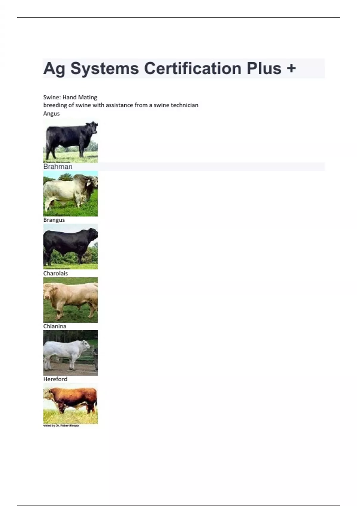 Ag Systems Certification Plus + Swine: Hand Mating breeding of swine with assistance from a swine technician Angus Brahman Brangus Charolais Chianina Hereford Braford Santa Gertudis Simmental Texas Longhorn Calving Cattle: Giving Birth Heifer Cattle: Young Female that has not given birth Bull Cattle: Intact Mature Male Cow Cattle: Mature Female that has given birth Steer Cattle: Castrated Male Natural Breeding breeding occurring via natural, sexual contact Artificial Insemination placement of semen into the uterus by a method other than physical sexual contact which improves the genetics of your herd without having to purchase another animal Embryo Transfer embryos are placed into the uterus of a female with the intent to establish a pregnancy Cloning process of producing genetically identical organisms Castration removing the testes to prevent unwanted breeding, leads to better meat quality and results in less fighting and aggressive behavior Surgical Castration testicles are removed using a scalpel or knife Elastic Banding bloodless method using rubber bands around the spermatic cord which cuts off blood supply to the testicles Burdizzo this method crushes the blood vessels which interrupts blood supply to the testicles Dehorning to remove or prevent the growth of horns to protect humans and other animals from being injured Identification Methods Hot Iron Branding Freeze Branding Ear Tagging Tattooing Beef Cattle Operations: Fee