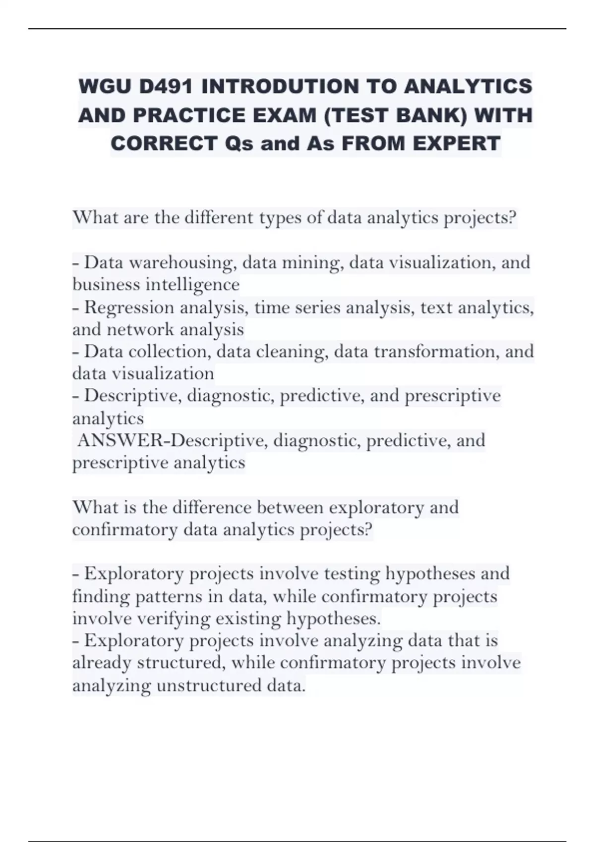 WGU D491 INTRODUTION TO ANALYTICS AND PRACTICE EXAM (TEST BANK) WITH CORRECT Qs and As FROM EXPERT What are the different types of data analytics projects? - Data warehousing, data mining, data visualization, and business intelligence - Regression analysis, time series analysis, text analytics, and network analysis - Data collection, data cleaning, data transformation, and data visualization - Descriptive, diagnostic, predictive, and prescriptive analytics ANSWER-Descriptive, diagnostic, predictive, and prescriptive analytics What is the difference between exploratory and confirmatory data analytics projects? - Exploratory projects involve testing hypotheses and finding patterns in data, while confirmatory projects involve verifying existing hypotheses. - Exploratory projects involve analyzing data that is already structured, while confirmatory projects involve analyzing unstructured data. - Exploratory projects involve analyzing large datasets, while confirmatory projects involve analyzing smaller datasets. - Exploratory projects involve analyzing data from a single source, while confirmatory projects involve integrating data from multiple sources. ANSWER-Exploratory projects involve testing hypotheses and finding patterns in data, while confirmatory projects involve verifying existing hypotheses. NOT CORRECT Which project is considered a data analytics project? - Developing a recommendation system to suggest new products to customers based on their past purchases - Creating a dashboard to visualize sales data and monitor inventory levels for a grocery store chain - Building a predictive model to forecast stock prices for a financial services company - Designing a database schema to store customer information for a retail store ANSWER-Creating a dashboard to visualize sales data and monitor inventory levels for a grocery store chain Why is quality control/assurance crucial for data engineers in a data analytics project? - It ensures that the data is analyzed in a timely manner. - It ensures that the data is stored in a secure location. - It ensures that the data is accurate and reliable. - It ensures that the data is accessible to all stakeholders. ANSWER-It ensures that the data is accurate and reliable. What does a data analyst do in a data analytics project? - Conducts exploratory data analysis to identify trends and patterns - Focuses on building machine learning models - Oversees data governance and data quality assurance - Designs and develops databases and data pipelines ANSWER-Conducts exploratory data analysis to identify trends and patterns What is the function of a data scientist in an organization? - To design and maintain data visualizations and dashboards - To oversee data governance and compliance - To work independently to analyze data and make decisions based on their findings - To conduct statistical analysis and machine learning modeling ANSWER-To conduct statistical analysis and machine learning modeling What is the role of a business intelligence analyst? - Overseeing data governance and compliance - Developing and implementing data processing pipelines - Designing and maintaining data visualizations and dashboards - Conducting statistical analysis and machine learning modeling ANSWER-Designing and maintaining data visualizations and dashboards What is a primary responsibility of a data engineer? - Designing and implementing data storage solutions - Designing and developing data visualizations for stakeholders - Analyzing and interpreting data to inform business decisions - Developing predictive models using machine learning algorithms ANSWER-Designing and implementing data storage solutions What is a primary responsibility of a machine learning engineer? - Developing predictive models using machine learning algorithms - Analyzing and interpreting data to inform business decisions - Designing and developing data visualizations for stakeholders - Designing and implementing data storage solutions ANSWER-Developing predictive models using machine learning algorithms What is a primary responsibility of a machine learning engineer? - To pilot the model, refine it, and fully deploy it - Designing and maintaining data visualizations and dashboards - Developing predictive models using machine learning algorithms - Business domain knowledge and communication ANSWER-Developing predictive models using machine learning algorithms What is the role and function of a decision scientist within an organization? - To oversee the company's human resources and ensure employee satisfaction - To analyze data and provide insights to support informed decision-making - To develop marketing strategies and increase sales revenue - To manage the company's finances and ensure profitability ANSWER-To analyze data and provide insights to support informed decision-making What is a primary responsibility of a data analyst? - Developing data visualizations for stakeholders - Designing and implementing data storage solutions - Conducting statistical analysis to identify patterns and trends - Developing predictive models using machine learning algorithms ANSWER-Conducting statistical analysis to identify patterns and trends What component of a data analytics project is typically completed by a data analyst? - To collect and store data for the organization - To make decisions based on the insights derived from data analysis - To clean and preprocess data to prepare it for analysis - To design and implement machine learning algorithms ANSWER-To clean and preprocess data to prepare it for analysis Which task is the data analyst responsible for within a data analysis project? - Developing and implementing software applications - Conducting statistical analyses and generating reports - Creating the project's overall goals and objectives - Collecting, cleaning, and loading customer data into a data warehouse ANSWER-Conducting statistical analyses and generating reports