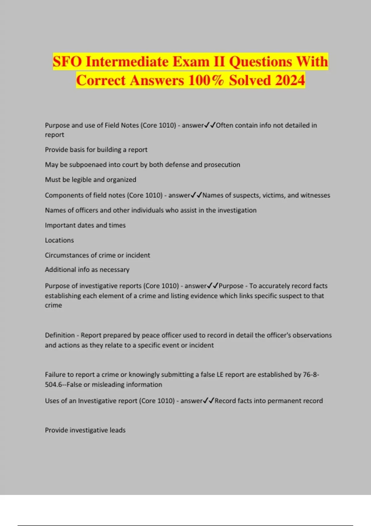 SFO Intermediate Exam II Questions With Correct Answers 100% Solved 2024 Purpose and use of Field Notes (Core 1010) - answerOften contain info not detailed in report Provide basis for building a report May be subpoenaed into court by both defense and prosecution Must be legible and organized Components of field notes (Core 1010) - answerNames of suspects, victims, and witnesses Names of officers and other individuals who assist in the investigation Important dates and times Locations Circumstances of crime or incident Additional info as necessary Purpose of investigative reports (Core 1010) - answerPurpose - To accurately record facts establishing each element of a crime and listing evidence which links specific suspect to that crime Definition - Report prepared by peace officer used to record in detail the officer's observations and actions as they relate to a specific event or incident Failure to report a crime or knowingly submitting a false LE report are established by 76-8- 504.6--False or misleading information Uses of an Investigative report (Core 1010) - answerRecord facts into permanent record Provide investigative leads Provide source for officer evaluation Assist officers prior to, or during, court appearances Provide statistical data Serve as reference material Prospective users of investigative reports (Core 1010) - answerImmediate supervisors and field training officers Detectives/investigators Representatives of other LE agencies Prosecutors, defense attorneys, and other attorneys Parole, probation, and corrections personnel Involved parties Media representatives Insurance agencies Components of investigative reports (Core 1010) - answerFacts needed to establish that a crime has been committed and all actions taken by peace officer(s) have been appropriate Identify who, what, where, when, why, & how Identify fundamental content that are common: Initial info ID of crime ID of involved parties Victim/witness statements Crime scene specifics Property info Officers' actions and legal basis for actions Mechanics of report writing (Core 1010) - answerProper use of grammar/punctuation Spelling Strong, clear, and concise sentences in Active Voice (first person) Statements are objective and avoid conclusions Appropriate use of paragraphs Proper word selection to clearly convey info to reader and avoid homophones (words that sound alike but have different meaning IE: leak and leek) Standardized citations and reports (Core 1010) - answerDI-9 Traffic Accident DUI Report & Citation Brady v. Maryland (Core 1010) - answer1963-Requires that all evidence be turned over to suspect's defense for examination. Information was withheld from defendant that Supreme Court held as material to both guilt and punishment Haney v. City of Los Angeles (Core 1010) - answer2003-Requires that officer's reports containing false information and effect of future credibility when testifying under oath be included in evidence turned over to defense Giglio v. United States (Core 1010) - answerSupreme court extended obligation to share exculpatory info with defendant to include info concerning credibility of government witnesses Communication Center (Core 1020) - answerResponsible for communicating needs of community to emergency responders Info and services available from Communication Centers (Core 1020) - answerDriver license checks Motor vehicle license checks and registered owner information Call and incident info Stolen property and criminal history checks NCIC National Crime Information Center-Contains various personal and property records reported from various LE Wants and Warrants ATL Attempt to locate or BOLO Be On the Look Out Common elements of proper protocol and etiquette when communicating with dispatch (Core 1020) When being dispatched to call: - answerBrief description of call Officer acknowledges call and waits for additional info Dispatch gives call info Officer acknowledges info and clarifies if needed Common elements of proper protocol and etiquette when communicating with dispatch (Core 1020) When contacting dispatch: - answerWait for opening or break Call using "to-from" method Wait for dispatch to acknowledge then give details (location first, then plate or vehicle description) Common elements of proper protocol and etiquette when communicating with dispatch (Core 1020) When giving vehicle description: - answerCYMBALS Color, Year, Make/model, Body style, All identifying marks, License