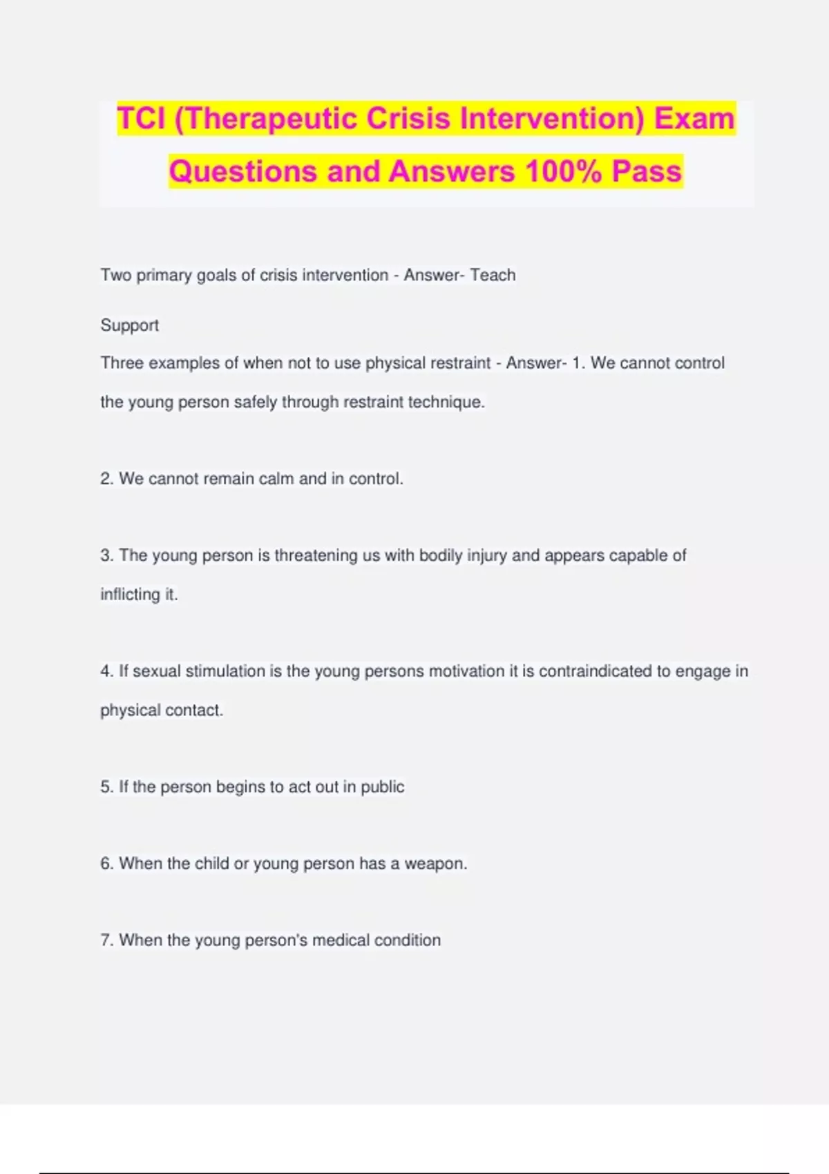 TCI (Therapeutic Crisis Intervention) Exam Questions and Answers 100% Pass Two primary goals of crisis intervention - Answer- Teach Support Three examples of when not to use physical restraint - Answer- 1. We cannot control the young person safely through restraint technique. 2. We cannot remain calm and in control. 3. The young person is threatening us with bodily injury and appears capable of inflicting it. 4. If sexual stimulation is the young persons motivation it is contraindicated to engage in physical contact. 5. If the person begins to act out in public 6. When the child or young person has a weapon. 7. When the young person's medical condition 8. When the young person has emotional problems 9. If the young person in taking medication The amount of psychological damage youth experience due to trauma depends on what 2 factors? - Answer- Age Intensity Two types of crisis - Answer- Situational Maturational