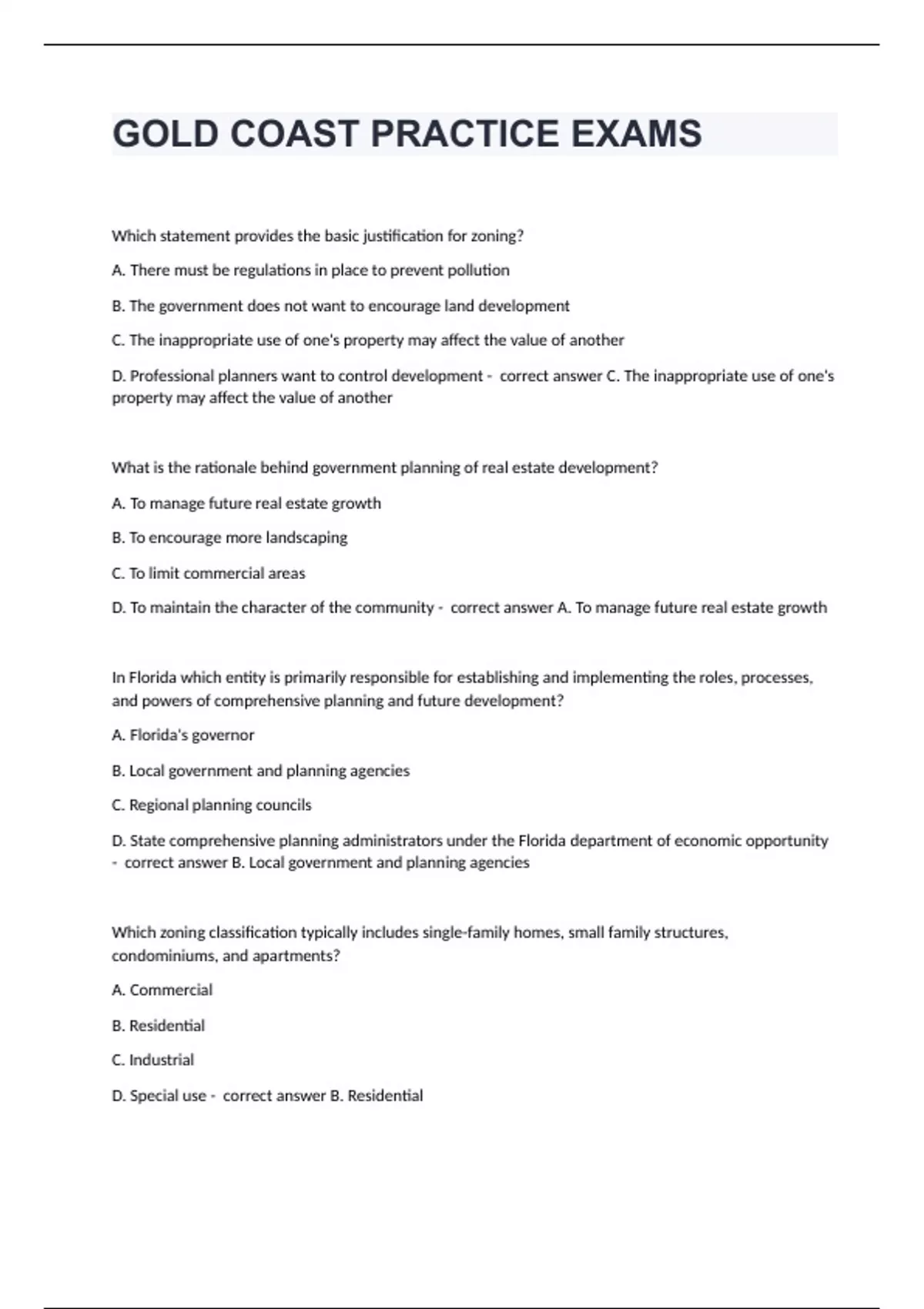 GOLD COAST PRACTICE EXAMS fully solved rated A+Which statement provides the basic justification for zoning? A. There must be regulations in place to prevent pollution B. The government does not want to encourage land development C. The inappropriate use of one's property may affect the value of another D. Professional planners want to control development - correct answer C. The inappropriate use of one's property may affect the value of another What is the rationale behind government planning of real estate development? A. To manage future real estate growth B. To encourage more landscaping C. To limit commercial areas D. To maintain the character of the community - correct answer A. To manage future real estate growth In Florida which entity is primarily responsible for establishing and implementing the roles, processes, and powers of comprehensive planning and future development? A. Florida's governor B. Local government and planning agencies C. Regional planning councils D. State comprehensive planning administrators under the Florida department of economic opportunity - correct answer B. Local government and planning agencies Which zoning classification typically includes single-family homes, small family structures, condominiums, and apartments? A. Commercial B. Residential C. Industrial D. Special use - correct answer B. Residential Which statement best describes the master plan? A. It must be inflexible B. It is prepared by the state legislator C. It stops growth D. It serves as a guide for an area's future growth - correct answer D. It serves as a guide for an area's future growth Which of the following would a church need in order to build in a residential neighborhood? A. Public zoning permit B. Special exception C. Variance D. Nonconforming use permit - correct answer B. Special exception What is the purpose of the zoning board of adjustment? A. To settle monetary claims by property owners B. To grant variances and special exceptions C. To develop the comprehensive plan D. To determine infrastructure requirements - correct answer B. To grant variances and special exceptions Which term is used to describe a property use that predates the current zoning ordinance but is allowed to exist for at least a period of time? A. Legally conforming B. Progressive C. Legally nonconforming D. Capitalized - correct answer C. Legally nonconforming Which statement which best describes a Planned Unit Development (PUD)? A. A PUD offers fewer amenities than are possible with more traditional forms of zoning B. A PUD impacts the environment to a greater degree than most zoning classifications C. A PUD prohibits the use of zero lot line development D. A PUD is also called cluster zoning - correct answer C. A PUD is also called cluster zoning Which statement is correct with respect to a Development of Regional Impact (DRI)? A. A DRI is defined as any development that substantially affects health, safety, or welfare of the citizens of more than one county B. The state of Florida as no authority concerning guidelines for development or review of a developments of regional impact C. The review process for a new DRI is concerned only with residential construction D. The federal government has no influence on local development - correct answer A. A DRI is defined as any development that substantially affects health, safety or welfare of citizens of more than one county Adequate infrastructure available to support growth and development was mandated by Florida's Growth Management Act and is specified in which of the following? A. DRI reviews B. Concurrency rules C. County zoning ordinances D. Local building codes - correct answer B. Concurrency rules What is the category of a business that meets payroll expense by using dollars a generated by persons who live in the immediate vicinity? A. Service B. Basic C. Export D. Regenerative - correct answer A. Service Which of the following would be considered a basic industry when performing an economic base analysis. A. Florist shop