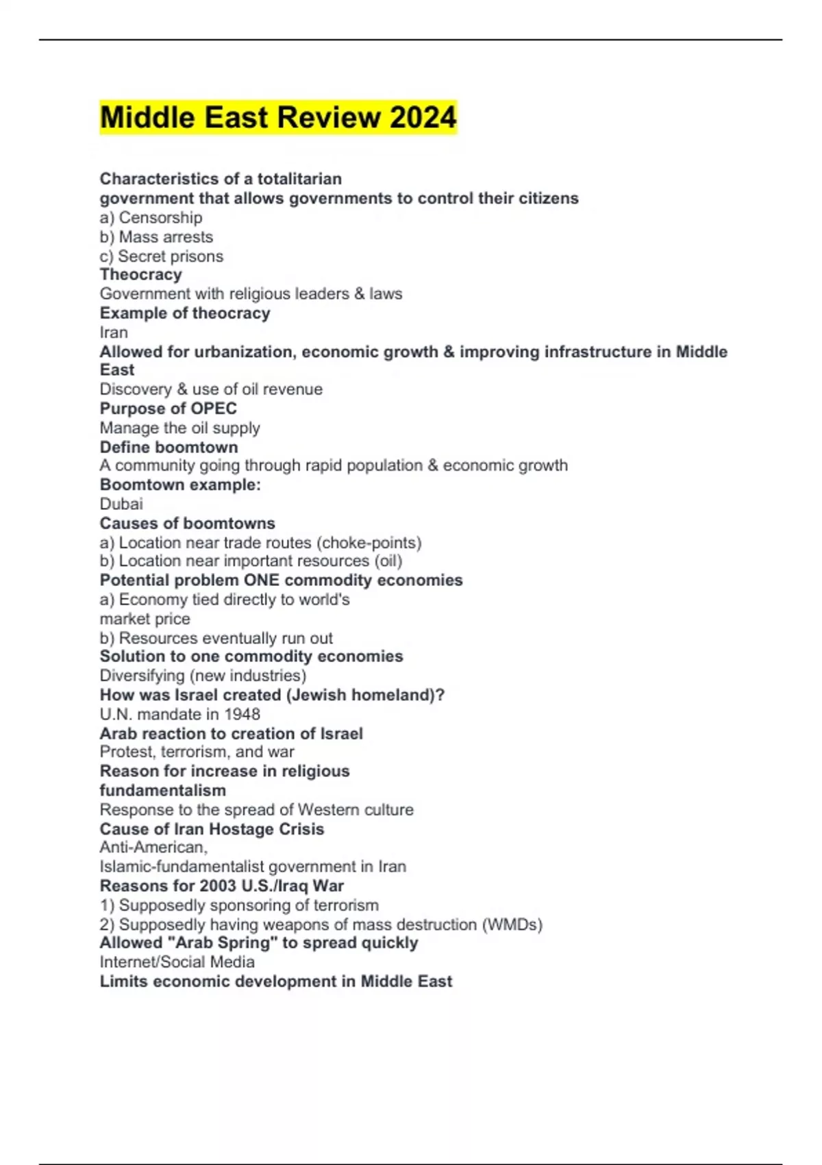 Middle East Review 2024 Characteristics of a totalitarian government that allows governments to control their citizens a) Censorship b) Mass arrests c) Secret prisons Theocracy Government with religious leaders & laws Example of theocracy Iran Allowed for urbanization, economic growth & improving infrastructure in Middle East Discovery & use of oil revenue Purpose of OPEC Manage the oil supply Define boomtown A community going through rapid population & economic growth Boomtown example: Dubai Causes of boomtowns a) Location near trade routes (choke-points) b) Location near important resources (oil) Potential problem ONE commodity economies a) Economy tied directly to world's market price b) Resources eventually run out Solution to one commodity economies Diversifying (new industries) How was Israel created (Jewish homeland)? U.N. mandate in 1948 Arab reaction to creation of Israel Protest, terrorism, and war Reason for increase in religious fundamentalism Response to the spread of Western culture Cause of Iran Hostage Crisis Anti-American, Islamic-fundamentalist government in Iran Reasons for 2003 U.S./Iraq War 1) Supposedly sponsoring of terrorism 2) Supposedly having weapons of mass destruction (WMDs) Allowed "Arab Spring" to spread quickly Internet/Social Media Limits economic development in Middle East