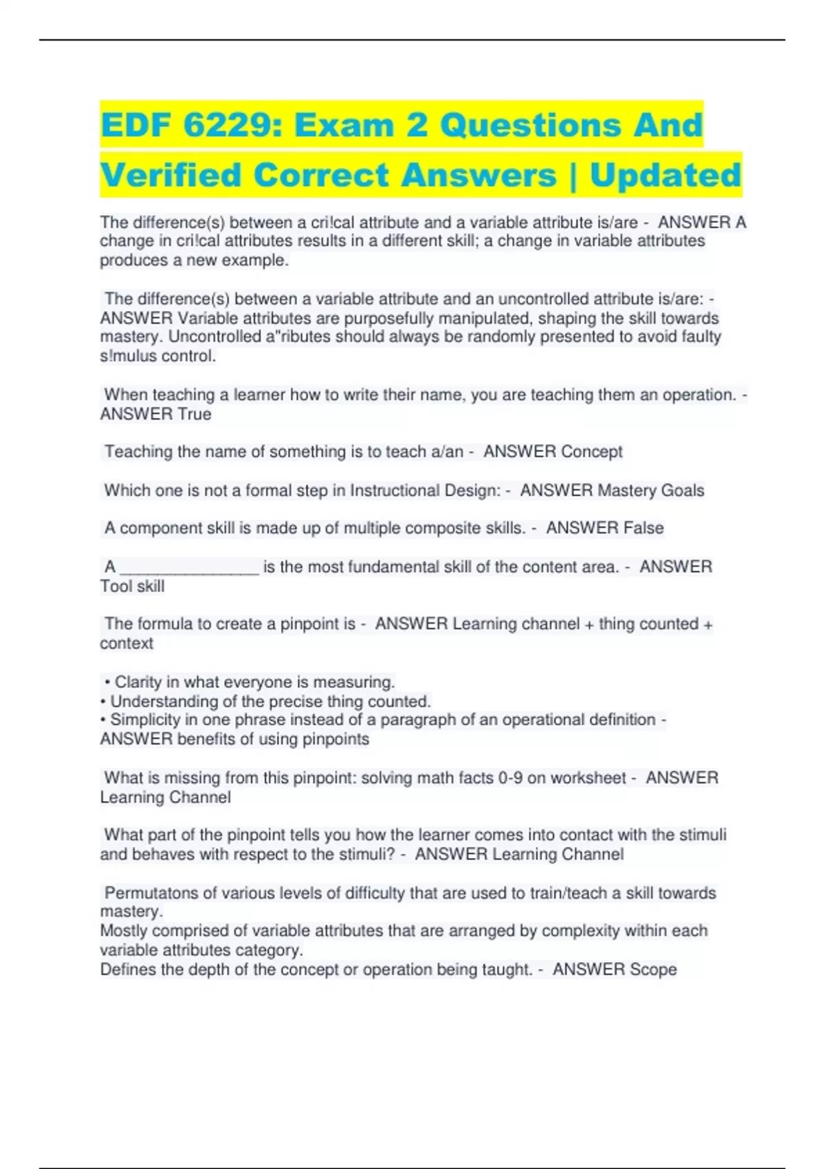 EDF 6229: Exam 2 Questions And Verified Correct Answers | Updated The difference(s) between a cri!cal attribute and a variable attribute is/are - ANSWER A change in cri!cal attributes results in a different skill; a change in variable attributes produces a new example. The difference(s) between a variable attribute and an uncontrolled attribute is/are: - ANSWER Variable attributes are purposefully manipulated, shaping the skill towards mastery. Uncontrolled a"ributes should always be randomly presented to avoid faulty s!mulus control. When teaching a learner how to write their name, you are teaching them an operation. - ANSWER True Teaching the name of something is to teach a/an - ANSWER Concept Which one is not a formal step in Instructional Design: - ANSWER Mastery Goals A component skill is made up of multiple composite skills. - ANSWER False A _______________ is the most fundamental skill of the content area. - ANSWER Tool skill The formula to create a pinpoint is - ANSWER Learning channel + thing counted + context • Clarity in what everyone is measuring. • Understanding of the precise thing counted. • Simplicity in one phrase instead of a paragraph of an operational definition - ANSWER benefits of using pinpoints What is missing from this pinpoint: solving math facts 0-9 on worksheet - ANSWER Learning Channel What part of the pinpoint tells you how the learner comes into contact with the stimuli and behaves with respect to the stimuli? - ANSWER Learning Channel Permutatons of various levels of difficulty that are used to train/teach a skill towards mastery. Mostly comprised of variable attributes that are arranged by complexity within each variable attributes category. Defines the depth of the concept or operation being taught. - ANSWER Scope