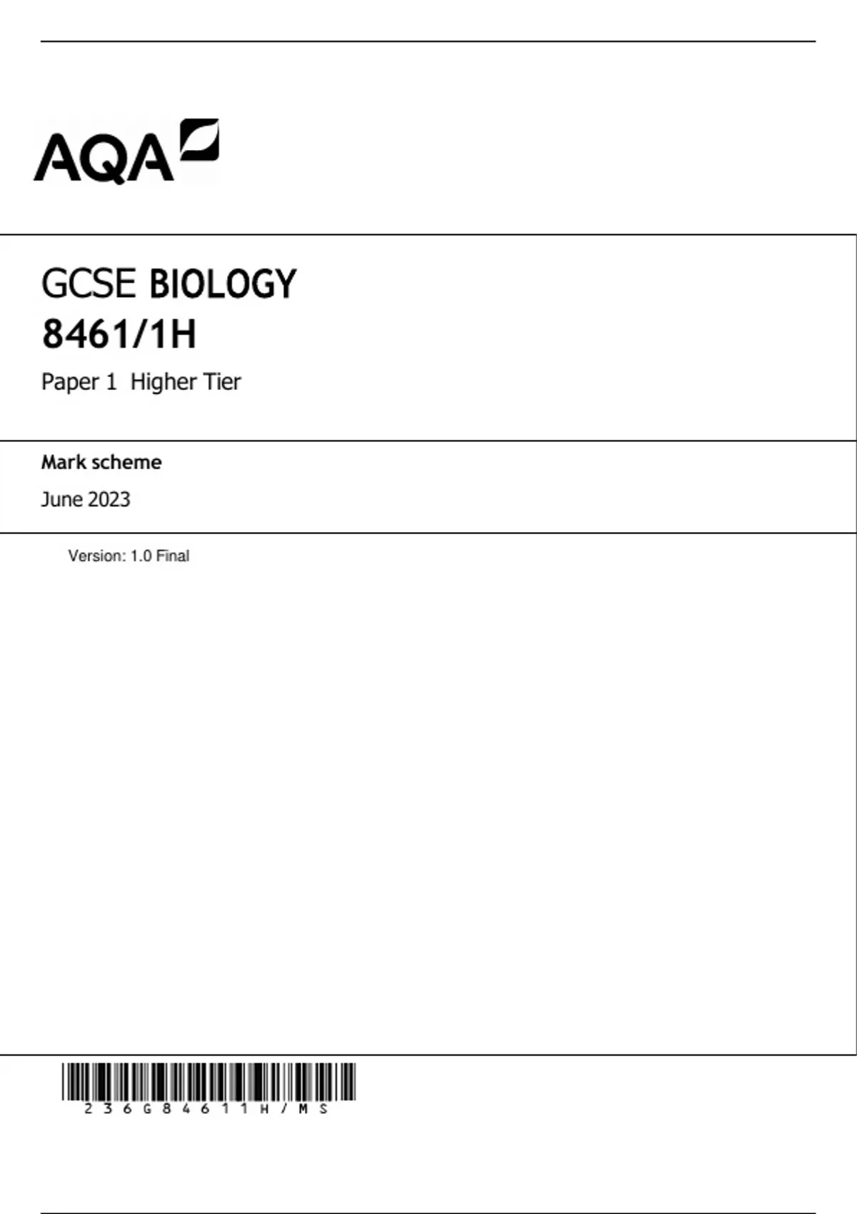 , MARK SCHEME – GCSE BIOLOGY – 8461/1H – JUNE 2023