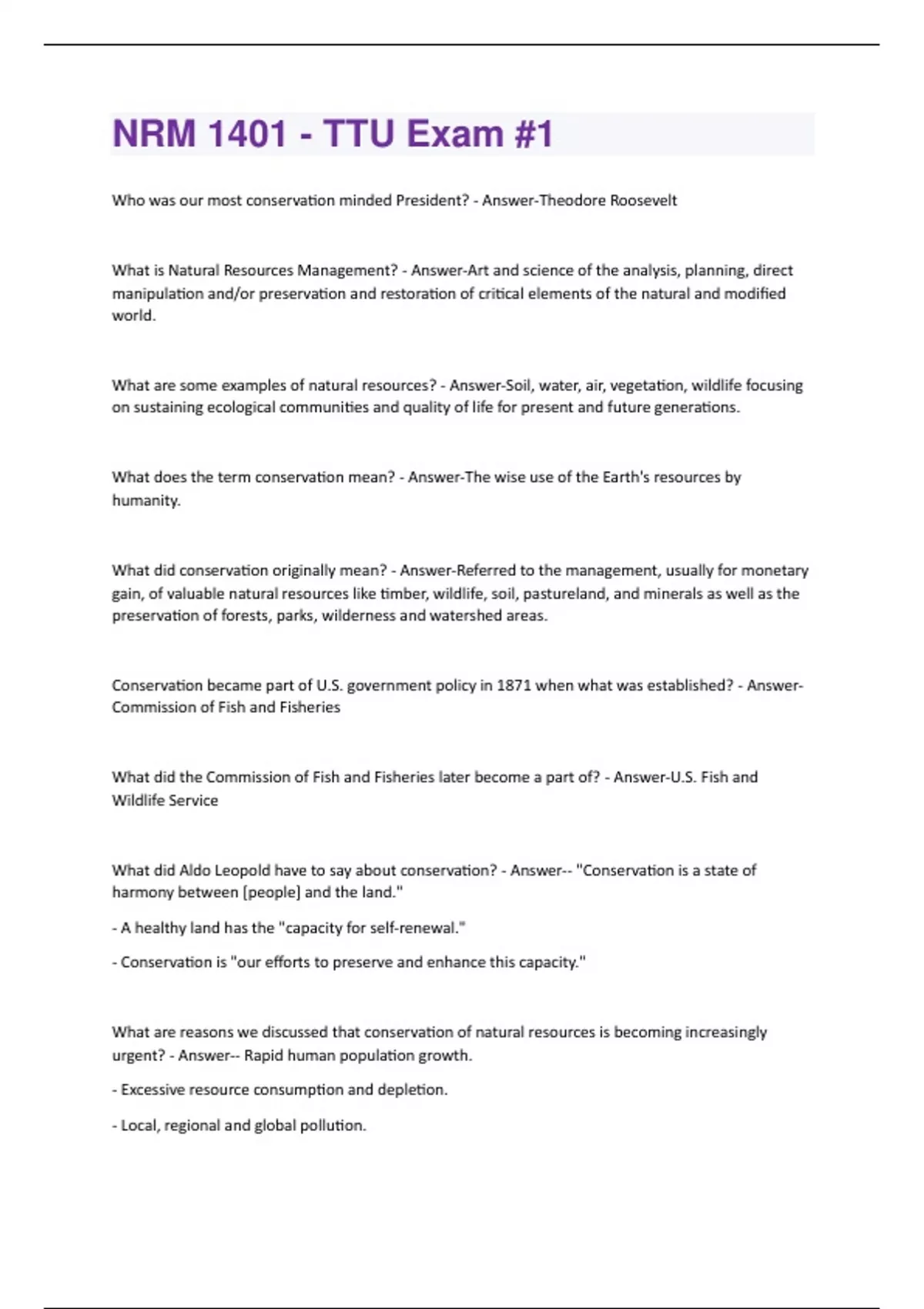 Who was our most conservation minded President? - Answer-Theodore Roosevelt What is Natural Resources Management? - Answer-Art and science of the analysis, planning, direct manipulation and/or preservation and restoration of critical elements of the natural and modified world. What are some examples of natural resources? - Answer-Soil, water, air, vegetation, wildlife focusing on sustaining ecological communities and quality of life for present and future generations. What does the term conservation mean? - Answer-The wise use of the Earth's resources by humanity. What did conservation originally mean? - Answer-Referred to the management, usually for monetary gain, of valuable natural resources like timber, wildlife, soil, pastureland, and minerals as well as the preservation of forests, parks, wilderness and watershed areas. Conservation became part of U.S. government policy in 1871 when what was established? - AnswerCommission of Fish and Fisheries What did the Commission of Fish and Fisheries later become a part of? - Answer-U.S. Fish and Wildlife Service What did Aldo Leopold have to say about conservation? - Answer-- "Conservation is a state of harmony between [people] and the land." - A healthy land has the "capacity for self-renewal." - Conservation is "our efforts to preserve and enhance this capacity." What are reasons we discussed that conservation of natural resources is becoming increasingly urgent? - Answer-- Rapid human population growth. - Excessive resource consumption and depletion. - Local, regional and global pollution.If enough cheap energy is available all things can be accomplished through advances in technology. - Answer-Optimist Viewpoint We are too late, technology solve many problems, but it cannot keep up with the exponential growth of population and demands on resources. - Answer-Pessimist Viewpoint What are the six key ecological principles of sustainability put forth by Daniel Chiras and how will they help enhance sustainability of natural resources? - Answer-1. Conservation 2. Recycling 3. Renewable Resource Use 4. Restoration 5. Population Control and Management 6. Adaptability What are some key components of what conservation means today? - Answer-- Conserving the Earth itself by protecting and attempting to enhance its capacity for self-renewal. - Emphasizes protection of entire ecological regions. Examples: ○ Great Barrier Reef off Australia ○ Adirondack State Park - Reconciling human use and conservation beyond boundaries of parks and wilderness areas is critical. What are some specific pieces of legislation in the U.S. that support conservation? What does each accomplish? - Answer-- National Environmental Policy Act (NEPA) - Clean Water Act - Clean Air Act - Endangered Species Act - Marine Mammal Protection Act - Migratory Bird Treaty Act- International treaties are critically needed to protect global ecosystems. What important events relating to natural resources management happened in the 1960s? - Answer- - Widespread realization that the quality of the air and water of the nation had reached hazardous levels that threatened public health. - Realization that many species of animals were in serious decline because of environmental factors as well as human action. ○ Birds and DDT ○ Habitat loss and pollution Why were the 1970s called the "Golden Age of Environmental Legislation"? What are some examples of Acts passed in this decade? - Answer-- National Environmental Policy Act - Passed in 1969, Signed into law in 1970 - Endangered Species Act passed, 1973 - Clean Air Act passed, 1970 - Clean Water Act passed, 1972