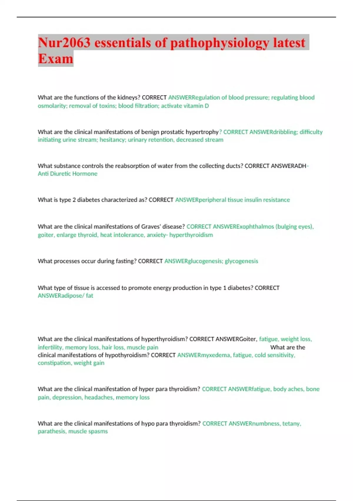 Nur2063 essentials of pathophysiology latest Exam What are the functions of the kidneys? CORRECT ANSWERRegulation of blood pressure; regulating blood osmolarity; removal of toxins; blood filtration; activate vitamin D What are the clinical manifestations of benign prostatic hypertrophy? CORRECT ANSWERdribbling; difficulty initiating urine stream; hesitancy; urinary retention, decreased stream What substance controls the reabsorption of water from the collecting ducts? CORRECT ANSWERADH- Anti Diuretic Hormone What is type 2 diabetes characterized as? CORRECT ANSWERperipheral tissue insulin resistance What are the clinical manifestations of Graves' disease? CORRECT ANSWERExophthalmos (bulging eyes), goiter, enlarge thyroid, heat intolerance, anxiety- hyperthyroidism What processes occur during fasting? CORRECT ANSWERglucogenesis; glycogenesis What type of tissue is accessed to promote energy production in type 1 diabetes? CORRECT ANSWERadipose/ fat What are the clinical manifestations of hyperthyroidism? CORRECT ANSWERGoiter, fatigue, weight loss, infertility, memory loss, hair loss, muscle pain What are the clinical manifestations of hypothyroidism? CORRECT ANSWERmyxedema, fatigue, cold sensitivity, constipation, weight gain What are the clinical manifestation of hyper para thyroidism? CORRECT ANSWERfatigue, body aches, bone pain, depression, headaches, memory loss What are the clinical manifestations of hypo para thyroidism? CORRECT ANSWERnumbness, tetany, parathesis, muscle spasms What are the clinical manifestations of ketoacidosis? CORRECT ANSWERfruity breath, drowsiness, nausea, thirst, confusion, lethargy, vomiting What mechanisms control hormone release and regulation? CORRECT ANSWERnegative feedback loop What hormones are released by the anterior pituitary gland? CORRECT ANSWERGrowth Hormone, prolactin, follicle stimulating hormone, thyroid stimulating hormone, LH, ACTH and endorphins What is diabetes insipidus? CORRECT ANSWERa disorder caused by inadequate amounts of ADH which causes excessive water loss clinical manifestations of diabetes insipidus CORRECT ANSWERpolyuria, nocturia, continuous thirst, and polydipsia clinical manifestations of Cushings syndrome? CORRECT ANSWERExcessive secretion of cortisol causes redistribution of fat, "moon face", "buffalo" hump on the back and pendulous abdomen. - Facial skin is flushed (high blood pressure), skin covering abdomen develops stretch marks - • ndividual bruises easily and wound healing is poor - Approximately 1/2 develop mental status changes from irritability to severe psychiatric disturbance - Females may experience changes due to increased androgen levels clinical manifestations of secondary hypothyroidism CORRECT ANSWERWeakness. - Fatigue. - Cold intolerance. - Constipation. - Weight gain. - Depression. - Joint or muscle pain. - Brittle fingernails. clinical manifestations of primary hypothyroidism CORRECT ANSWERfatigue. - lethargy. - sensitivity to cold. - depression. - muscle weakness. clinical manifestations of primary aldosteronism CORRECT ANSWERhypertension and hypokalemia clinical manifestations of secondary aldosteronism CORRECT ANSWERHigh blood pressure. - Low level of potassium in the blood. - Feeling tired all the time. - Headache. - Muscle weakness. - Numbness. What is myxedema? CORRECT ANSWERsevere hypothyroidism; non pitting edema What are the causes of hypothyroidism? CORRECT ANSWERHashimoto's disease: most common when the immune system attacks the thyroid cells after surgical or radioactive treatment for hyperthyroidism head or neck radiation for cancer iodine deficiency What are the three p's in diabetes? CORRECT ANSWERpolydipsia, polyuria, polyphagia What is the difference between primary and secondary endocrine disorders? CORRECT ANSWERPrimary endocrine disease inhibits the action of downstream glands, malfunction of the hormone producing gland; Secondary endocrine disease is indicative of a problem with the pituitary gland. What is the cause of Cushing syndrome? CORRECT ANSWERExcessive corticosteroids What is acute gastritis? CORRECT ANSWERTransient inflammation of the gastric mucosa What is chronic gastritis? CORRECT ANSWERChronic mucosal inflammatory changes leading to atrophy and intestinal metaplasia. This is mostly due to H. Pylori, but in some cases it can be autoimmune. What causes gastritis? CORRECT ANSWERAcute - circulatory disturbances (shock) and exposure to exogenous irritants (drugs [aspirin], alcohol, chemicals, lactose intolerance) Chronic - cause is unknown is probably mediated by immunologic mechanism or related to infection with H. pylori What is amenorrhea? CORRECT ANSWER- absence of menstruation