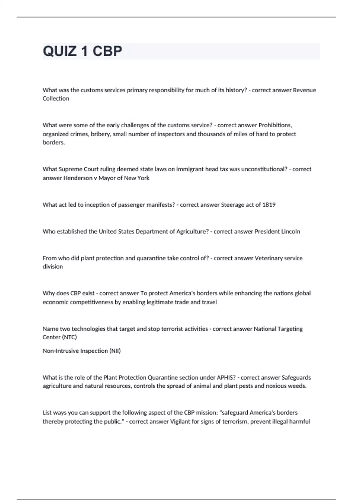What was the customs services primary responsibility for much of its history? - correct answer Revenue Collection What were some of the early challenges of the customs service? - correct answer Prohibitions, organized crimes, bribery, small number of inspectors and thousands of miles of hard to protect borders. What Supreme Court ruling deemed state laws on immigrant head tax was unconstitutional? - correct answer Henderson v Mayor of New York What act led to inception of passenger manifests? - correct answer Steerage act of 1819 Who established the United States Department of Agriculture? - correct answer President Lincoln From who did plant protection and quarantine take control of? - correct answer Veterinary service division Why does CBP exist - correct answer To protect America's borders while enhancing the nations global economic competitiveness by enabling legitimate trade and travel Name two technologies that target and stop terrorist activities - correct answer National Targeting Center (NTC) Non-Intrusive Inspection (NII) What is the role of the Plant Protection Quarantine section under APHIS? - correct answer Safeguards agriculture and natural resources, controls the spread of animal and plant pests and noxious weeds. List ways you can support the following aspect of the CBP mission: "safeguard America's borders thereby protecting the public." - correct answer Vigilant for signs of terrorism, prevent illegal harmful things, such as terrorists, their tools, illegal narcotics, prohibited plant and animal products and aliens from entering the US What are CBPs core values - correct answer Vigilance, Service to Country, Integrity List ways you can support the following aspect of the CBP ETHOS: We steadfastly enforce the laws of the United States while fostering our Nations economic security through lawful international trade and travel. - correct answer Perform effective targeting of big risk travelers and cargo Know and follow the laws and regulations of the US Ensure that lawful trade continues to help our strong economy Define corruption - correct answer The abuse of ones authority or position for personal gain Identify vulnerabilities to corruption - correct answer Authority and Uniform What are the possible consequences of corruption? - correct answer Jail time, loss of family, failure to accomplish the CBP mission, loss of employment l, threats to family and friends. What is the Joint Intake Center (JIC) - correct answer Central "clearinghouse" for receiving, processing, and tracking allegations of misconduct involving people employed by CBP and ICE What are some potential warning signs of corruption? - correct answer Manipulation of assignments( trading shifts, requesting specific assignments, resisting schedule changes) , conduct violations (leave abuse patterns, cell phone, chronic tardiness) behavior changes, relationships, finances What is the role of the CBP officer in recognizing and reporting corruption within the CBP workforce? - correct answer Alert to signs, don't look the other way, keep eyes and mind open What is the process for reporting suspicions of corruption? - correct answer Report to JIC What are indicators of corrupt behavior - correct answer Manipulation of assignments, conduct violations, behavior changes, relationships, finances Stop sticks must never be used to stop what types of vehicles? - correct answer 2 or 3 wheeled vehicles, school or public buses, vehicles transporting hazmat What are the report and review process for the use of stop sticks - correct answer Must be identified by serial number, incident must be assigned a tracking number, a report must be submitted to immediate supervisor by the end of the shift When may a stop stick be used ? - correct answer Port runner, car attempts to flee while being escorted to secondary, another agency requests deployment in an emergency Behaviors that identify professionalism - correct answer Clean uniform, professional tone of voice, punctuality Elements of professionalism - correct answer Appearance, environment, demeanor, etiquette, communication, conduct What is CBPs pledge to travelers ? - correct answer Cordially greet and welcome you to the US Treat you with courtesy, dignity, and respect. Explain the CBP process to you Have a supervisor listen to your comments Define Bias - correct answer An unconscious belief that governs our behavior Define stereotype - correct answer Making a broad generalization about an individual/group of people before the individual or group has been encountered Define culture - correct answer The totality of socially transmitted behavior patterns, arts, beliefs, institutions, and all other products of human work and thought Define prejudice - correct answer A judgment or opinion formed before facts are known, usually involving negative or unfavorable thoughts