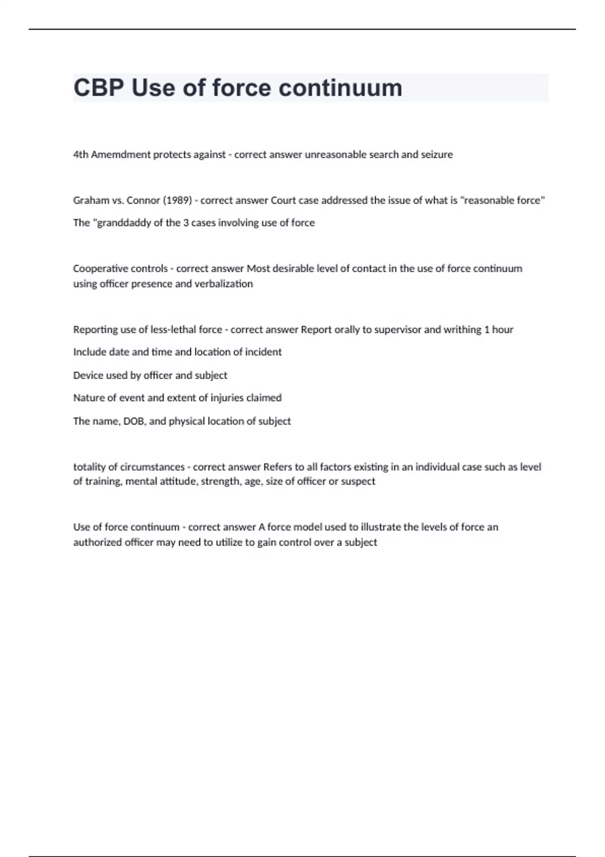 4th Amemdment protects against - correct answer unreasonable search and seizure Graham vs. Connor (1989) - correct answer Court case addressed the issue of what is "reasonable force" The "granddaddy of the 3 cases involving use of force Cooperative controls - correct answer Most desirable level of contact in the use of force continuum using officer presence and verbalization Reporting use of less-lethal force - correct answer Report orally to supervisor and writhing 1 hour Include date and time and location of incident Device used by officer and subject Nature of event and extent of injuries claimed The name, DOB, and physical location of subject totality of circumstances - correct answer Refers to all factors existing in an individual case such as level of training, mental attitude, strength, age, size of officer or suspect Use of force continuum - correct answer A force model used to illustrate the levels of force an authorized officer may need to utilize to gain control over a subject
