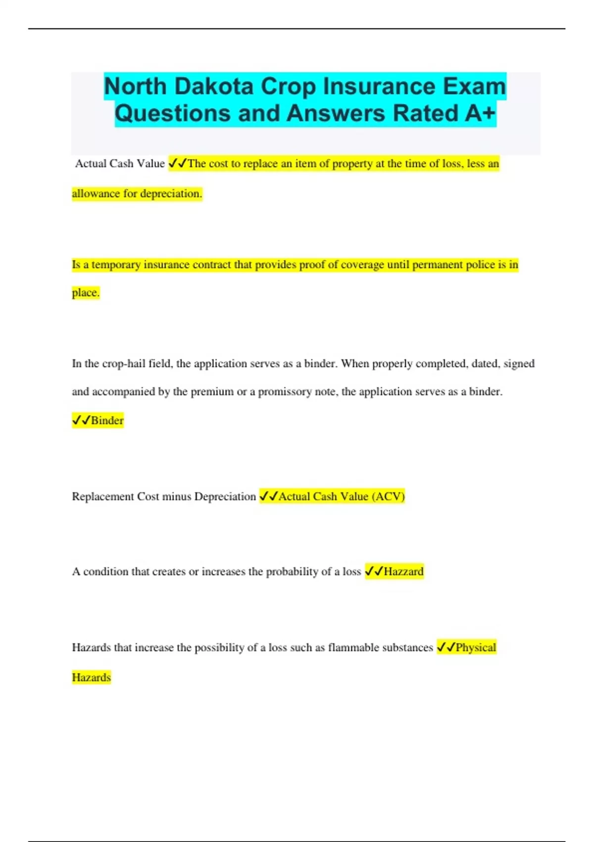 North Dakota Crop Insurance Exam Questions and Answers Rated A+ Actual Cash Value The cost to replace an item of property at the time of loss, less an allowance for depreciation. Is a temporary insurance contract that provides proof of coverage until permanent police is in place. In the crop-hail field, the application serves as a binder. When properly completed, dated, signed and accompanied by the premium or a promissory note, the application serves as a binder. Binder Replacement Cost minus Depreciation Actual Cash Value (ACV) A condition that creates or increases the probability of a loss Hazzard Hazards that increase the possibility of a loss such as flammable substances Physical Hazards Dishonesty, Lack of Integrity Moral Hazards Careless attitude, indifference, failure to care Morale Hazards The cause of possible loss. the event insured against Peril A loss that occurs at a specific time and place or over a period of time. such as fire or hail storm. Occurrence The lack of reasonable care that is required to protect other from the unreasonable chance of harm. Negligence The maximum amount of money the insurance company will pay for a particular loss, or for losses sustained during a period of time. Also called limit of coverage, limit of insurance and policy limit Limits of Liability Assignment of interest You may not assign your interest in this policy without our written consent you may assign to another party your right to an indemnity for the crop year only on our form and with our approval. the assignee with have the right to submit the loss notices and forms required by the policy. Assignment of Indemnity Final Planting Date FPD last day to plant unless insured for late planting Last day to apply for coverage Sales Closing Date SCD The last day to report the acreage planted. if not reported, insurance will not be in effect Acreage Reporting Date ARD Last day to pay the premium with out being charged interest Payment Due Date Last day to request cancellation of policy for the next year Cancellation Date last day to report production for actual production history APH Production Reporting Date PRD Date insurance company will terminate the policy for nonpayment Debt Termination Date anyone who wants to insure their share in an insurable crop. owner operators, tenants, renters, crop-share landlords, partnerships, corporations and estates Insured Eligibility Yield/Revenue Guarantee for APH approved yield X coverage level Yield/Revenue Guarantee for YP APH approved yield X coverage level X projected price A license may not be renewed or a new license issued in those lines for which the licensee who fails to comply with continuing education requirements Renewal How much is the applicable renewal fee? $25