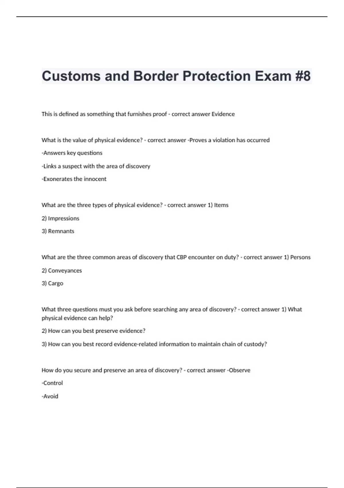 This is defined as something that furnishes proof - correct answer Evidence What is the value of physical evidence? - correct answer -Proves a violation has occurred -Answers key questions -Links a suspect with the area of discovery -Exonerates the innocent What are the three types of physical evidence? - correct answer 1) Items 2) Impressions 3) Remnants What are the three common areas of discovery that CBP encounter on duty? - correct answer 1) Persons 2) Conveyances 3) Cargo What three questions must you ask before searching any area of discovery? - correct answer 1) What physical evidence can help? 2) How can you best preserve evidence? 3) How can you best record evidence-related information to maintain chain of custody? How do you secure and preserve an area of discovery? - correct answer -Observe -Control -Avoid What are the roles of a discovering officer? - correct answer 1) Identifies the area of discovery 2) Preserves the area 3) Documents the initial conditions 4) Identifies evidence 5) Prepares briefings What are the roles of a seizing officer? - correct answer 1) Controls entry and exit 2) Secures subject(s) 3) Secures equipments and consultation area 4) Maintains communication between areas of discovery Identify the different types of contraband that may lead to penalties, seizures, and possibly to criminal prosecutions - correct answer - Instruments of terror/precursor chemicals - Narcotics - Pharmaceuticals - Monetary instruments - Endangered species - Commercial articles - Prohibited or restricted articles What are the four modes of entry? - correct answer 1) Land Borders 2) Airports 3) Seaports 4) Rail Order the following steps in the evidence collection process: 1) Perform a final inspection to make sure no evidence has been overlooked 2) Determine the order of evidence collection 3) Document the collection of each piece of evidence - correct answer 2, 3, 1 True or False: All occurrences and details at the area of discovery should be well-documented - correct answer True What are the two methods of evidence documentation? - correct answer 1) Notes 2) Photography What type of information would you include in the documentation of evidence? - correct answer -Type of seizure -Date and time discovered -Location of area of discovery -Description of area of discovery -Name of officers and personnel at the area of discovery -Names of people involved in the search and evidence collection -Evidence found at the area of discovery True or False: Photography of evidence should include panoramic views, close-up views, views of the exterior surroundings, and views of the contraband concealment areas - correct answer True All evidence must be processed according to protocol. How would one go about conducting this? - correct answer -Record the chain of custody -Describe evidence in detail -Do not commingle evidence -Include your contact information -Supply background information to the analyst Order the following CBP protocol steps for the preservation of fraudulent documents: 1) Place in evidence bag with a copy of an I-213/I-275 2) Document the seizure on CBP Form 6051S 3) Write FDAU control number on the evidence bag 4) Enter into SEACATS - correct answer 2, 4, 1, 3 Under what circumstances may specialized assistance be required? - correct answer -Forensic needs -Unusual environments -Officer safety The ____________________________ provides critical, scientific support to CBP & DHS and is instrumental in assisting the agency to accomplish its mission of protecting the U.S. citizens and its economy from acts of terrorism and disruption of legitimate trade - correct answer Laboratories and Scientific Services Directorate (LSSD) What are the four issues that LSSD deals with? - correct answer 1) Trade Enforcement 2) WMD 3) Intellectual Property Rights 4) Narcotics Enforcement In what five ways can a laboratory assist in an investigation? - correct answer 1) Analyzing substances 2) Processing fingerprints 3) Conduct trace evidence comparisons 4) Perform serial number restorations 5) Revealing forgeries Identify the CBP form with which you are required to document fraudulent document seizure - correct answer 6051S Order the following steps that are undertaken when processing soft Secondary referrals: 1) Inspection of travelers 2) Closeout procedures 3) Perform system queries 4) Review referral reason - correct answer 4, 3, 1, 2 In airport and seaport environments, ________ displays all travelers referred for Secondary - correct answer CSIS In land environments, ________ shows vehicles referred for Secondary - correct answer CSIS What are some common reasons for referrals for soft Secondary? - correct answer -IDENT hits -TECS matches -Travelers claiming USC w/o proper documents -LPRs w/o proper documents, lack of status -Nonimmigrant classifications requiring Secondary -Processing paroles and waivers -Processing refugees and asylees Match the following system queries with their correct respective tasks