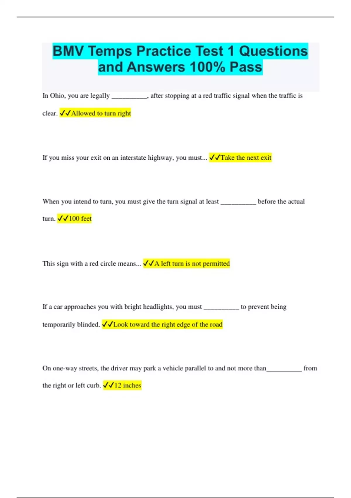 BMV Temps Practice Test 1 Questions and Answers 100% Pass In Ohio, you are legally __________, after stopping at a red traffic signal when the traffic is clear. Allowed to turn right If you miss your exit on an interstate highway, you must... Take the next exit When you intend to turn, you must give the turn signal at least __________ before the actual turn. 100 feet This sign with a red circle means... A left turn is not permitted If a car approaches you with bright headlights, you must __________ to prevent being temporarily blinded. Look toward the right edge of the road On one-way streets, the driver may park a vehicle parallel to and not more than__________ from the right or left curb. 12 inches If you hit a deer and cause its death, you must... Report the collision to a game protector or other law enforcement officer In Ohio, it is unlawful for a driver 21 or above, to operate a vehicle with a blood-alcohol concentration (BAC) of... 0.8% or higher This red octagonal image in the sign with an arrow mark indicates... An approaching stop sign What does this sign indicate to a driver? A slippery road ahead As per Ohio's child restraint law, children who are under the age of__________ and weigh less than 40 pounds must be properly restrained in an approved child safety seat. Four It is against the law to make a left turn at a red light EXCEPT... From a one-way street to another one-way street You are allowed to drive in the left lane of the highway in all of the following situations, except... When moving slower than the posted speed sign What does this sign indicate? A sharp turn to the right ahead The maximum speed limit in all alleys within a municipal corporation is... 15 mph When a driver is being passed by another vehicle, the law requires the driver of the slower vehicle... To maintain a constant speed and stay to the right until the other driver has safely passed When you are closely following another vehicle at night, you must use... Low-beam headlights If a school bus with its four red lights flashing is stopped on a street or road which has fewer than four lanes, then... All traffic must stop from all directions and wait till the lights have gone up This sign at an intersection directs... Pedestrians to enter the crosswalk When you are approaching the rear of a vehicle with an orange triangle, you must... Pass with care This regulatory sign is used.. To prohibit traffic