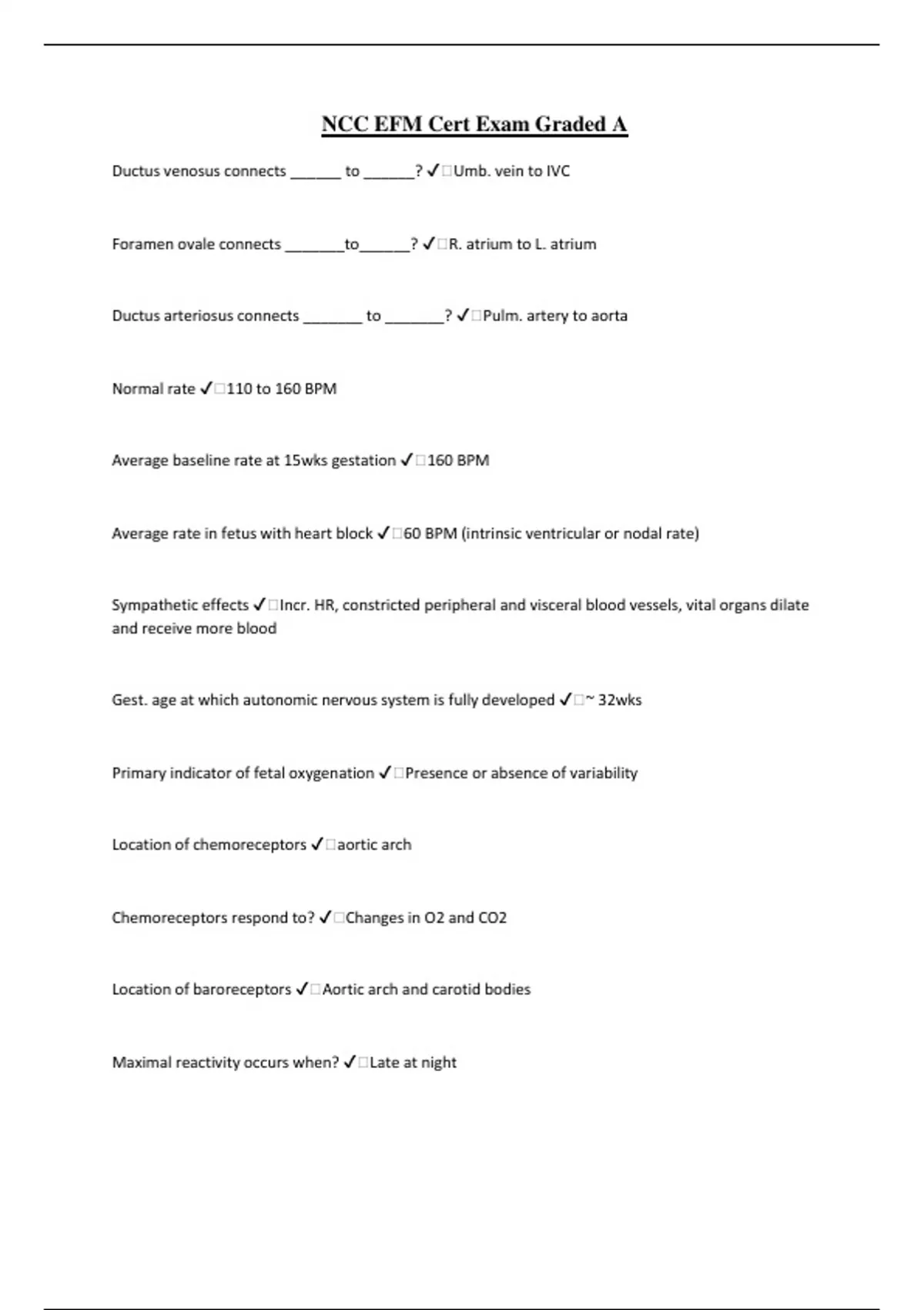 NCC EFM Cert Exam Graded A Ductus venosus connects ______ to ______? ️Umb. vein to IVC Foramen ovale connects _______to______? ️R. atrium to L. atrium Ductus arteriosus connects _______ to _______? ️Pulm. artery to aorta Normal rate ️110 to 160 BPM Average baseline rate at 15wks gestation ️160 BPM Average rate in fetus with heart block ️60 BPM (intrinsic ventricular or nodal rate) Sympathetic effects ️Incr. HR, constricted peripheral and visceral blood vessels, vital organs dilate and receive more blood Gest. age at which autonomic nervous system is fully developed ️~ 32wks Primary indicator of fetal oxygenation ️Presence or absence of variability Location of chemoreceptors ️aortic arch Chemoreceptors respond to? ️Changes in O2 and CO2 Location of baroreceptors ️Aortic arch and carotid bodies Maximal reactivity occurs when? ️Late at night Max duration of fetal nonreactivity? ️80min Sensitivity ️Probablity of detecting a true positive Specificity ️Probability that true negative will be detected False positive ️erroneosly positive when reality is negative False negative ️erroneously negative when reality is positive NST ️Two 15x15 accels in 20min (up to 40min) % of false positive CSTs? ️~ 30% BPP components ️1) Fetal breathing movements 2) Gross body movements 3) Fetal tone 4) Reactive fetal heart rate 5) Qualitiative amniotic fluid volume BPP Score of 10 ️Normal BPP Score of 8 ️Nl infant, low risk of chronic asphyxia BPP Score of 6 ️Borderline result - rpt in 24hrs BPP Score of 4 ️Suspect chronic asphyxia BPP Score of 0-2 ️Strongly suspect chronic asphyxia Early manifestation of fetal acidosis? ️Non-reacive NST and loss of FBM Change in FBM with maternal glucose changes? ️FBM incr. with rising mGlu FBM decr. with mHYPOglycemia Maternal smoking effects FBM how? ️FBM decr. with msmoking Corticosteroids effects FBM? ️corticosteroids may decr. FBM Maternal PAO2 at sea level? ️~105mmHg Change in cardiac output and SVR in pre-E? ️CO and SVR INCREASED in pre-E Prolonged decels occured in ___% of uterine rupture? ️71% Signif. neonatal morbidity occured when ____min or longer elapsed between onset of HFR decel and