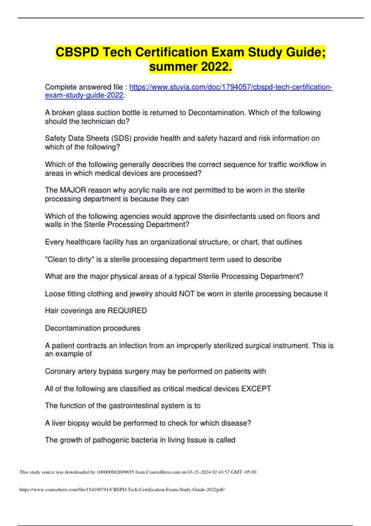 A broken glass suction bottle is returned to Decontamination. Which of the following should the technician do? Safety Data Sheets (SDS) provide health and safety hazard and risk information on which of the following? Which of the following generally describes the correct sequence for traffic workflow in areas in which medical devices are processed? The MAJOR reason why acrylic nails are not permitted to be worn in the sterile processing department is because they can Which of the following agencies would approve the disinfectants used on floors and walls in the Sterile Processing Department? Every healthcare facility has an organizational structure, or chart, that outlines "Clean to dirty" is a sterile processing department term used to describe What are the major ph